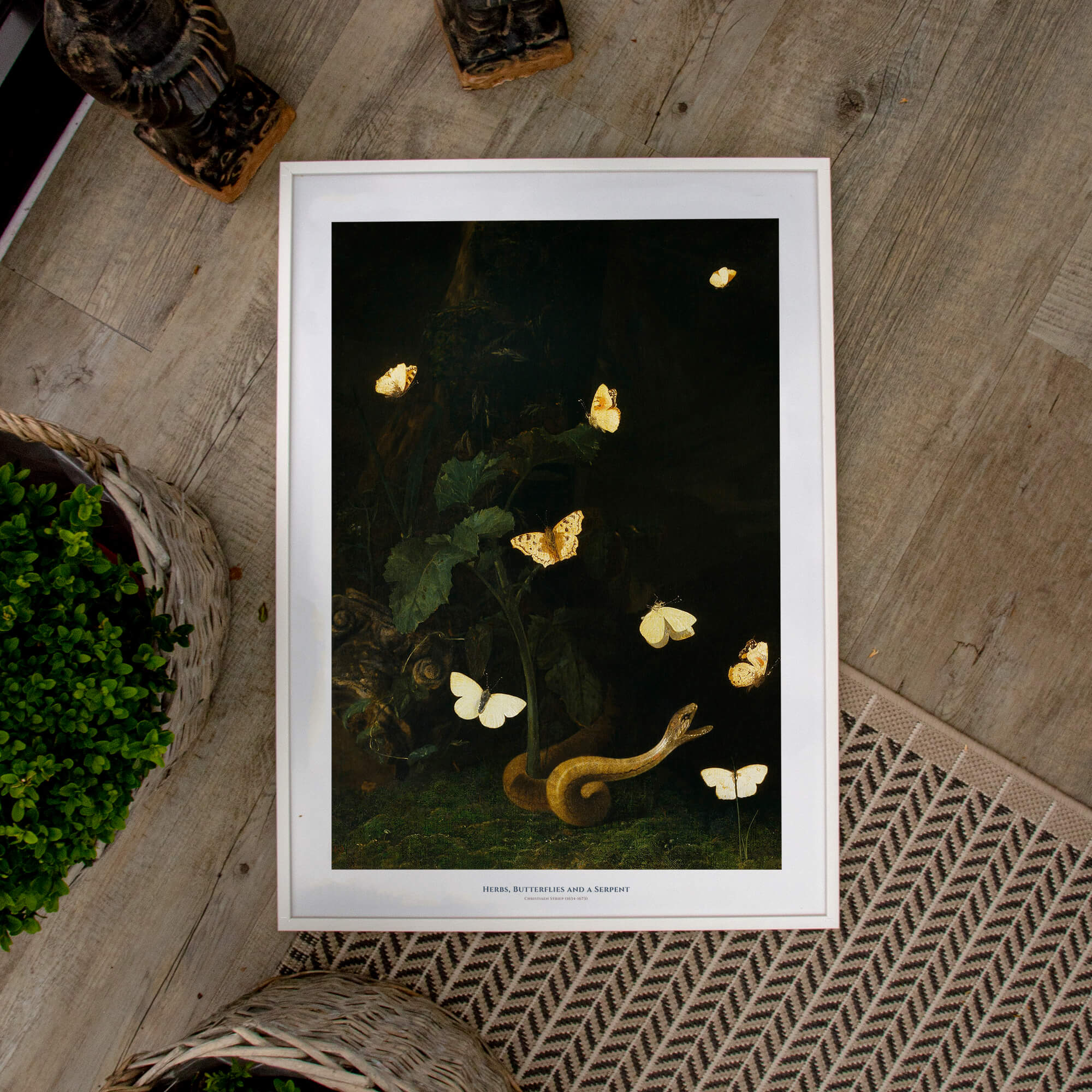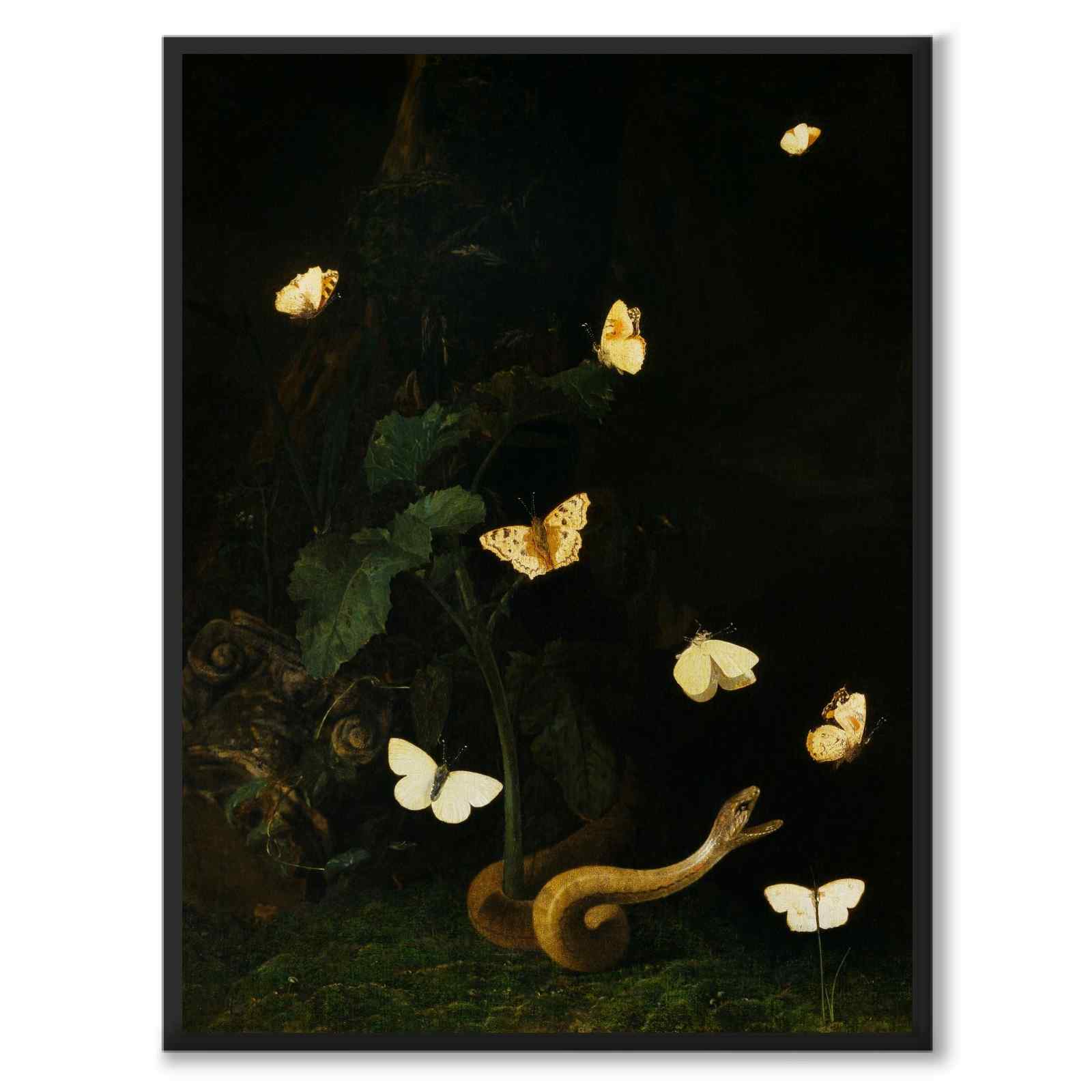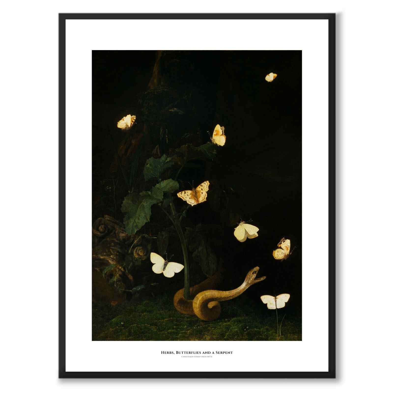 Poster with the painting Forest herb, butterflies and snake by the Dutch artist Christian Jansz Striep (1633-1673) . The motif consists of a natural scene with bright butterflies and a greyish-yellow snake that dramatically reaches out to catch one of them with an open gap. In many Dutch still lifes from the 17th century, the artists introduced various kinds of symbols. Here the snake could be interpreted as a symbol of evil, while the bright butterflies could symbolize the good, the pure or the soul