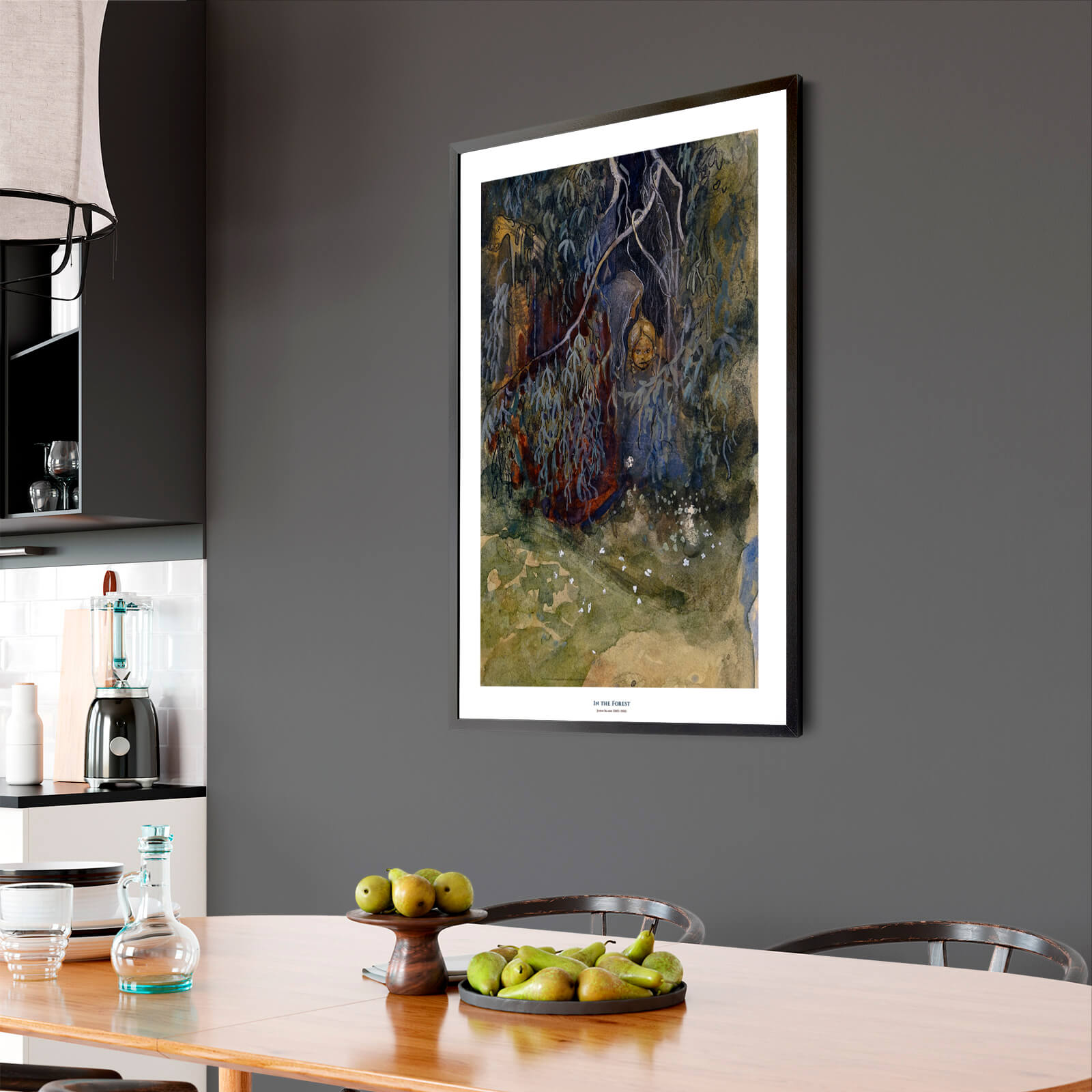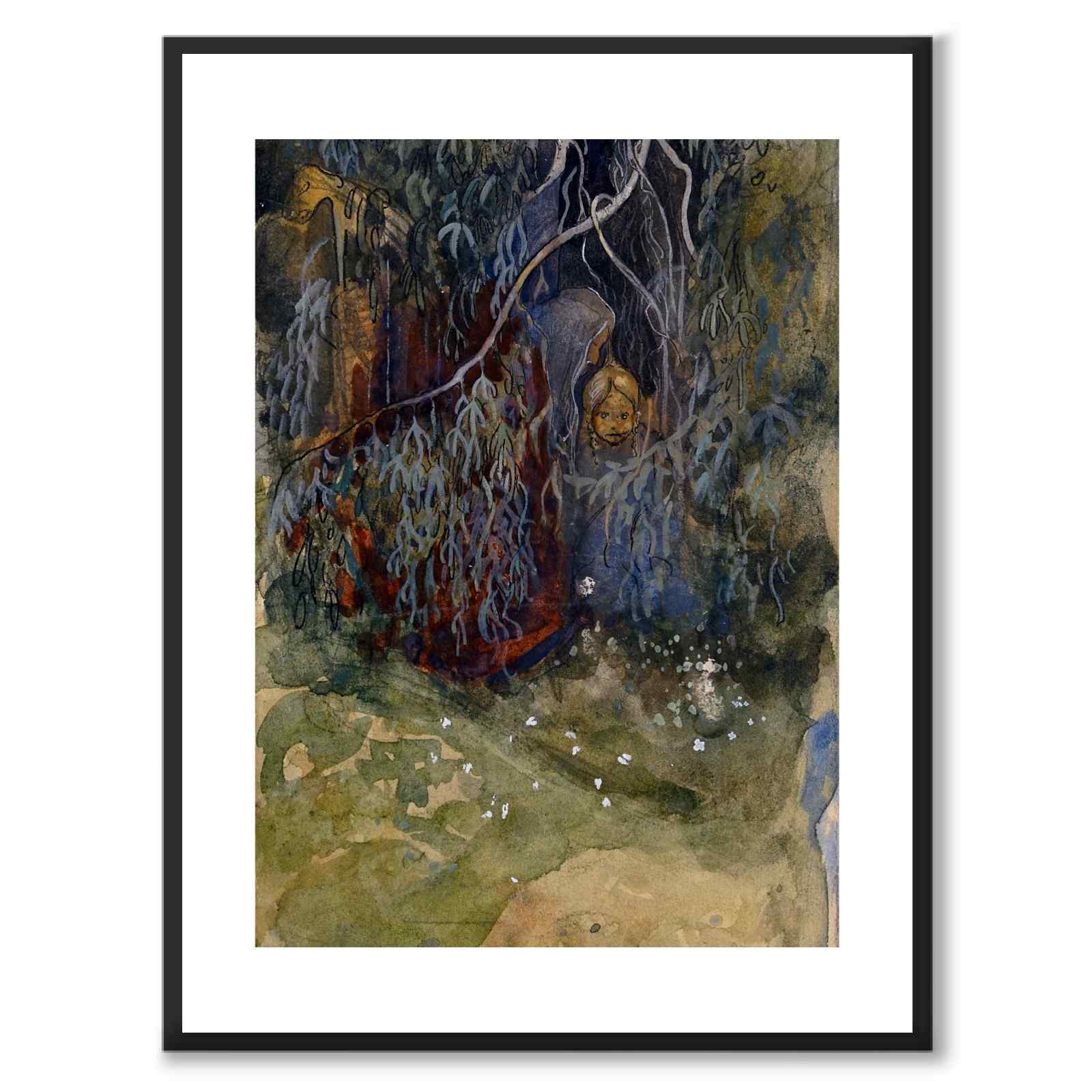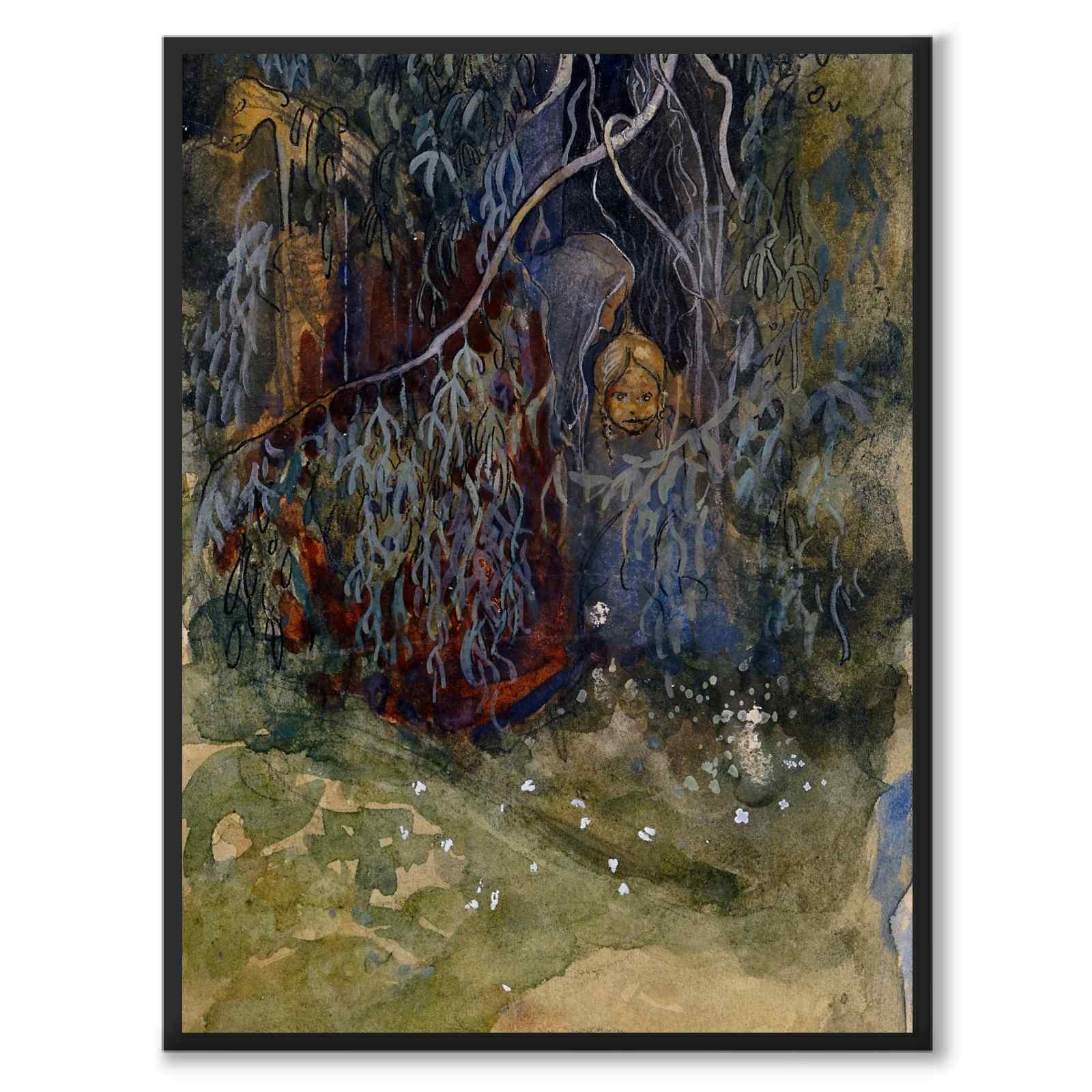 Poster with the painting In the Woods by John Bauer from 1901. A woman and a little girl with long braids stand hidden and peeking out among the branches of a fir tree.