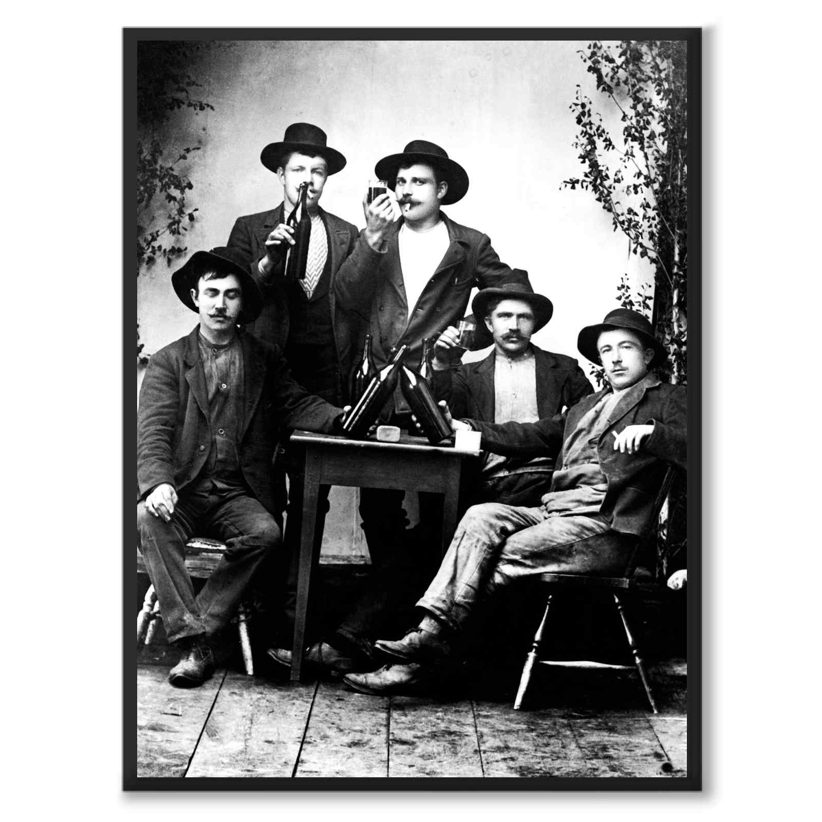Five road workers celebrate Midsummer at the turn of the century. The men are dressed for work and sit around a small table with birch ice in the background. The men smoke and toast, some drink straight from the bottle, others from glasses. The road construction went between Lima and Rörbäcksnäs in Dalarna.