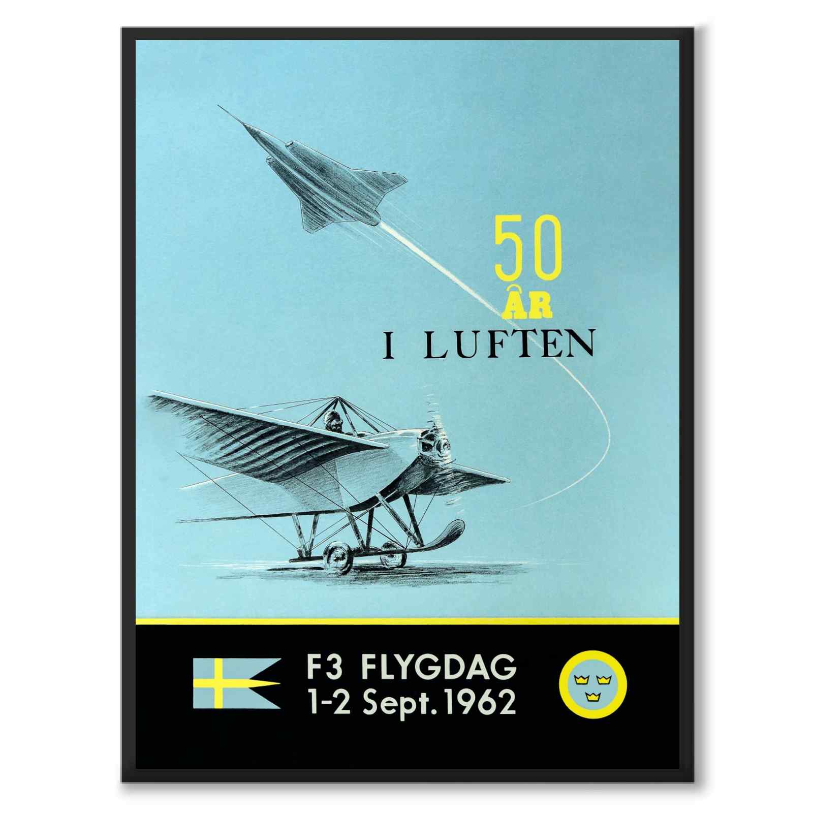 Advertising poster for the flight flotilla F3's flight day on 1-2 September 1962. The flight flotilla was also called the Östgöta air flotilla. Aviation Day was to mark 50 years in the air.