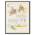 The book was used to teach children the alphabet in an entertaining and educational way, as each letter is linked to a picture and a short rhyme. In this illustration, the letters C & D are presented, where the letter c represents the image with a bicycle and the letter d reflects the image with a doll.