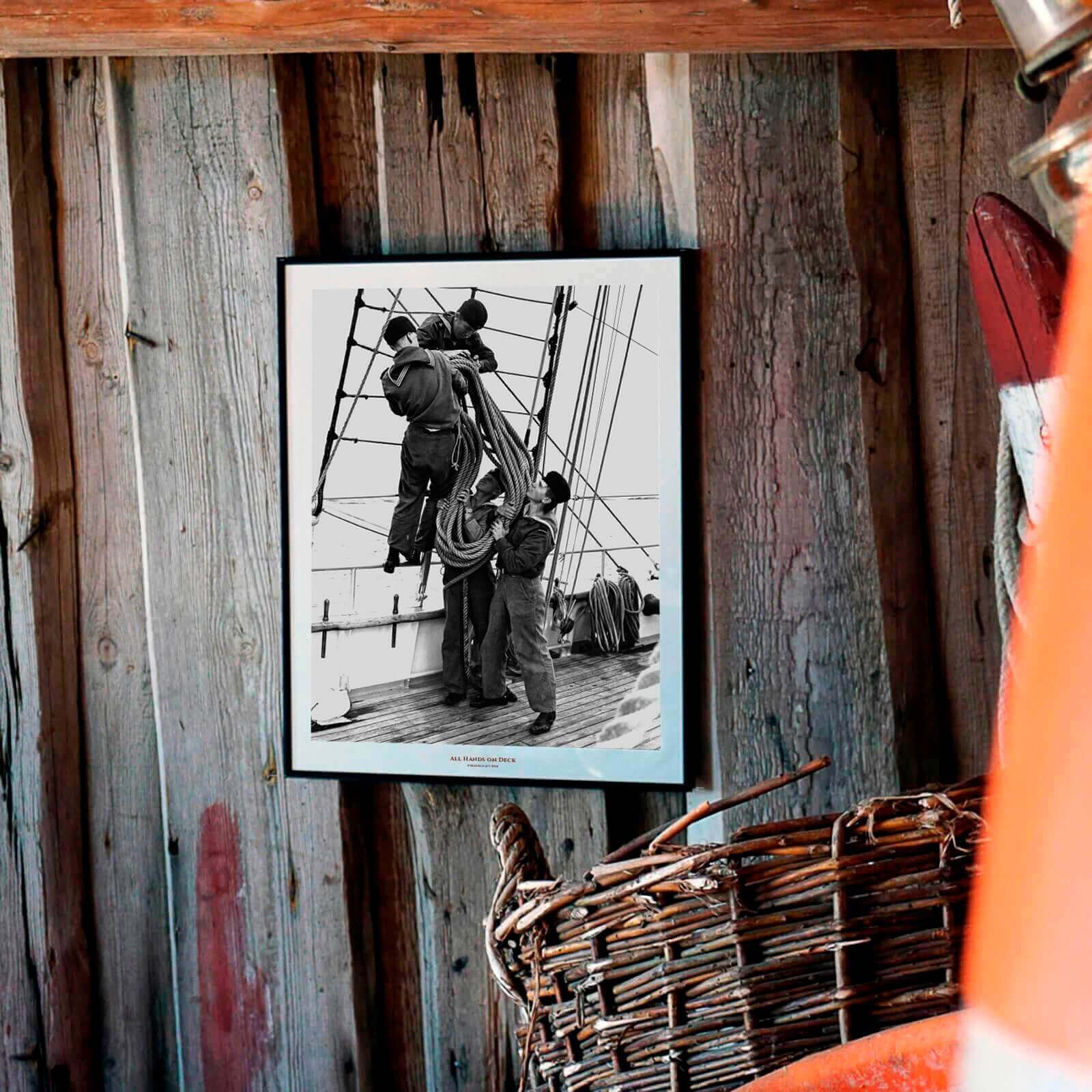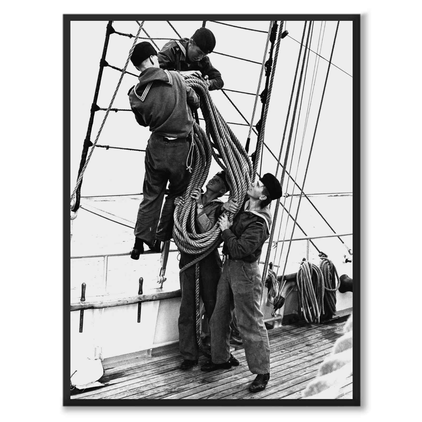 Four handsome cadets try to lift a rope on one of the Swedish navy's school ships in 1968. The school ship is either the Gladan or the Falken. The ships were used, among other things, to train naval officers.