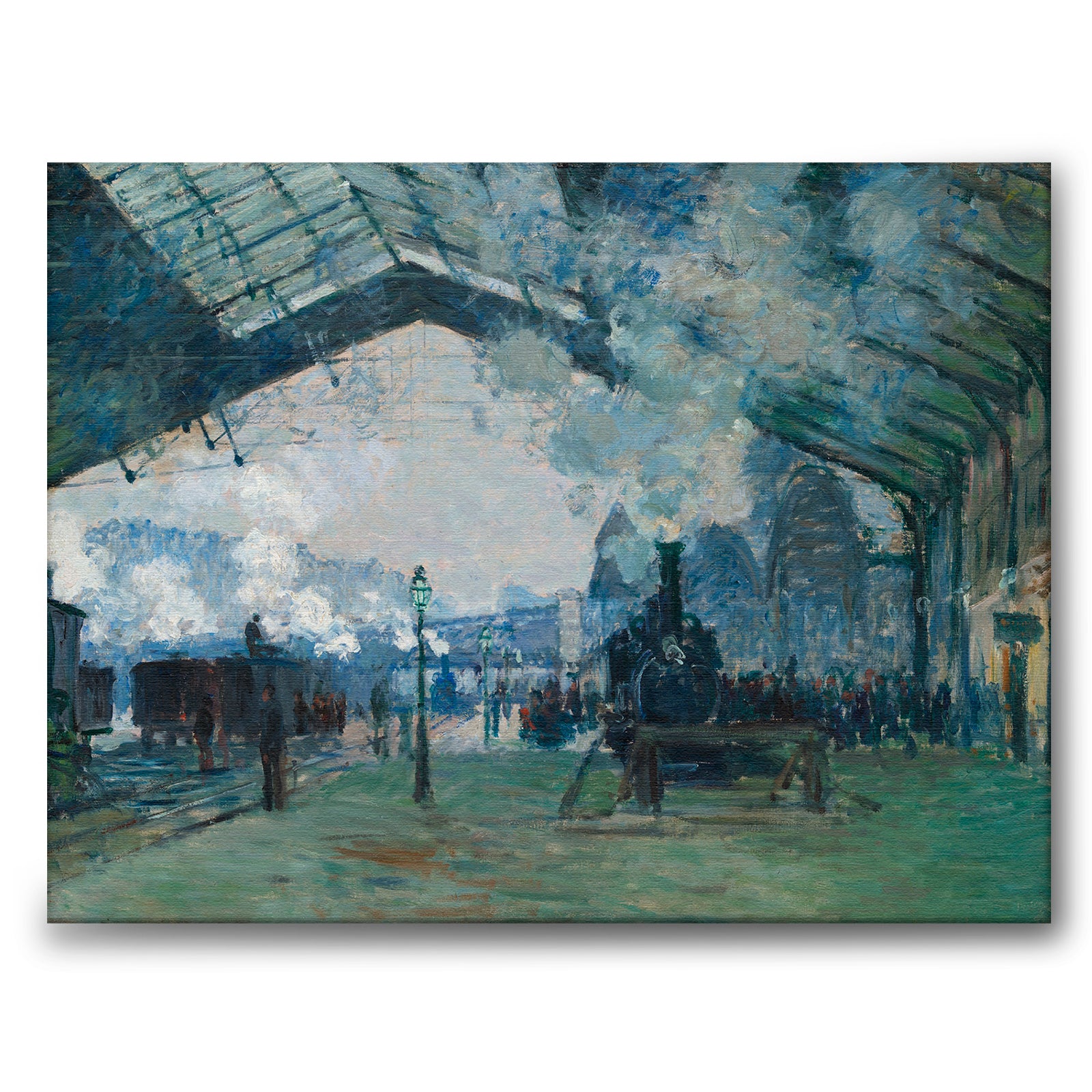 Canvas with the painting Arrival of the Normandy Train, Gare Saint-Lazare from 1877. Impressionist artists often created homages to the modern side of Paris where their paintings often depicted the grand boulevards, elegant new buildings and modern constructions such as iron bridges and railway tracks.