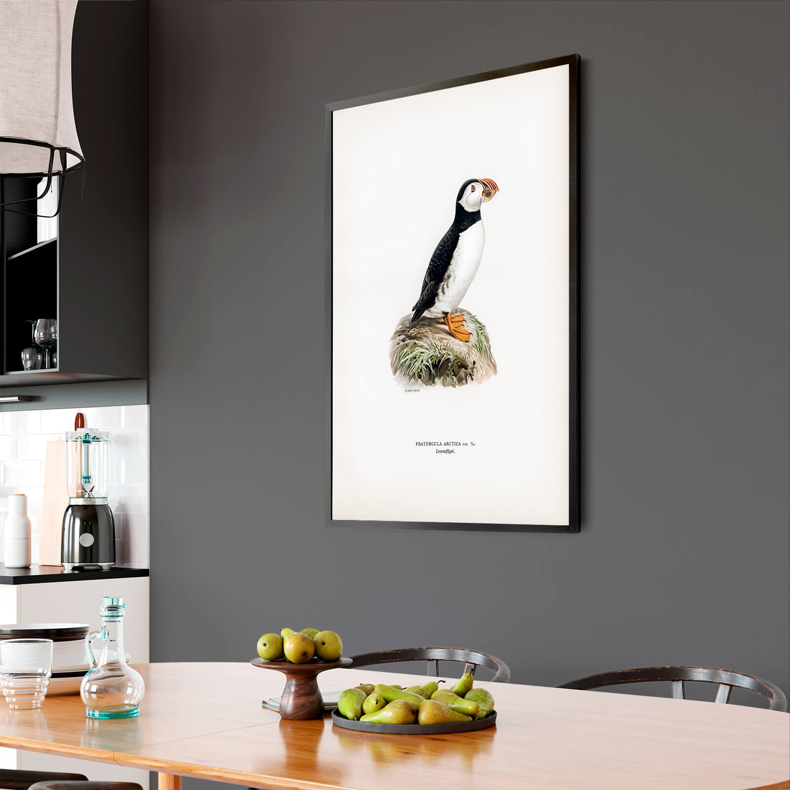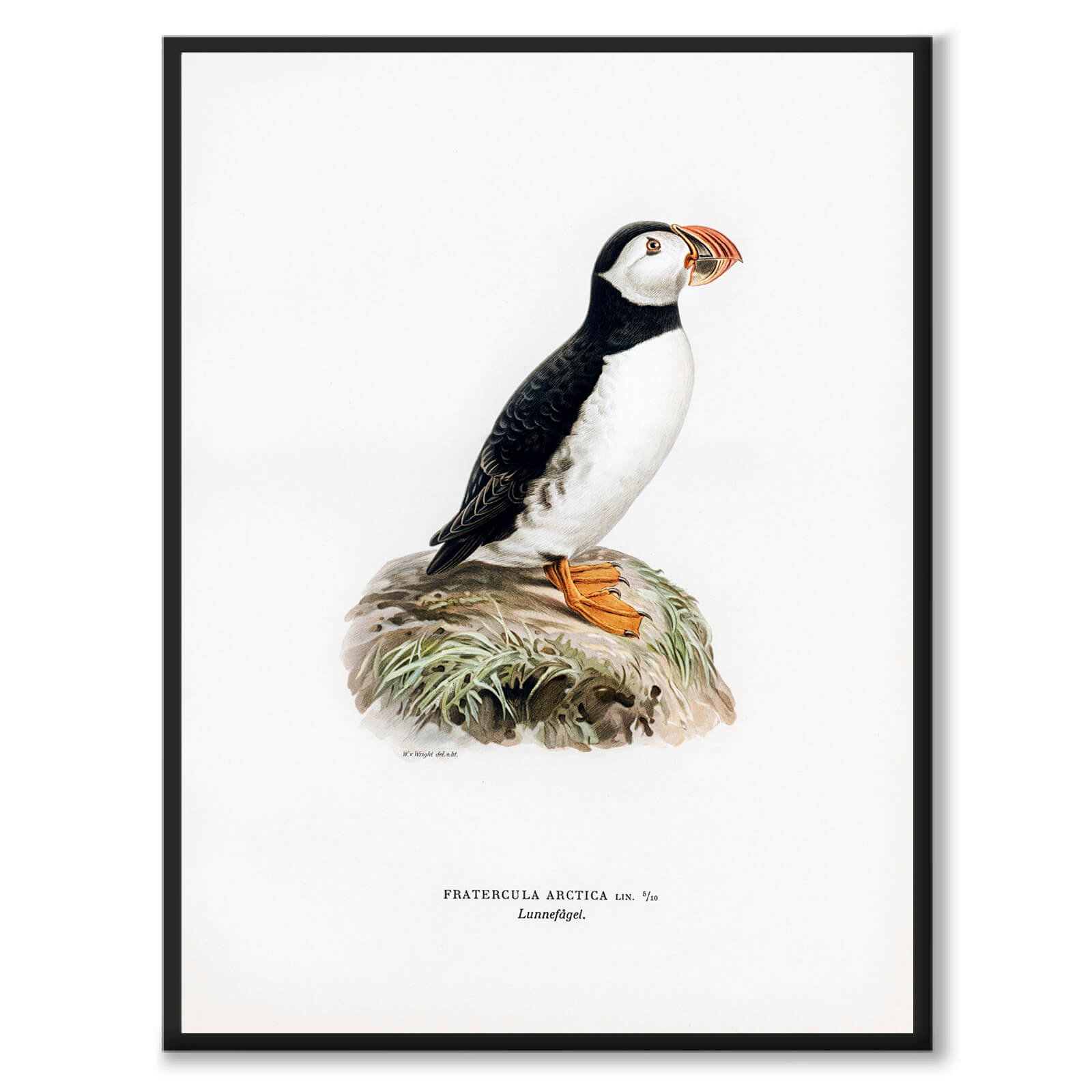 Poster with an old poster of a puffin . The illustration was drawn by the von Wright brothers and published at the beginning of the 20th century in the book Swedish Birds After Nature Och På Sten Ritad . In the picture we see, among other things, the text Fratercula arctica - Latin for the name of the species and Swedish translated "the little brother". It is uncertain what the bird's Latin name was inspired by.