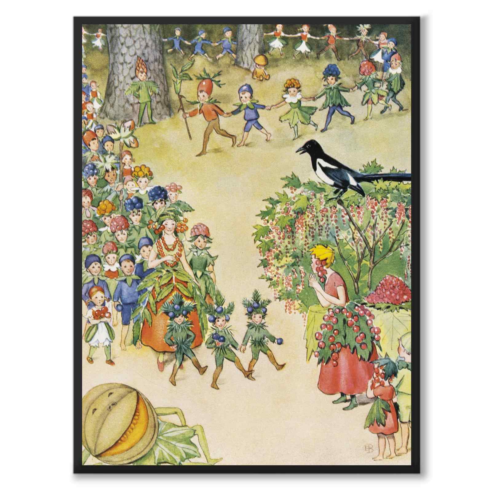 Mrs Rönnnbär rushes so red and happy to hang a string of pearls around her neck, little junipers trundle so cheerfully to make it early to the waltz. And guests come in thousands, millions, trillions and more. "Oh alas, they won't fit in my hall and more are still coming!" "What shall I do, poor wife who has received millions of guests?" — "Yes, yes," said the magpie, "that's how you do when wild berries are invited to parties!"