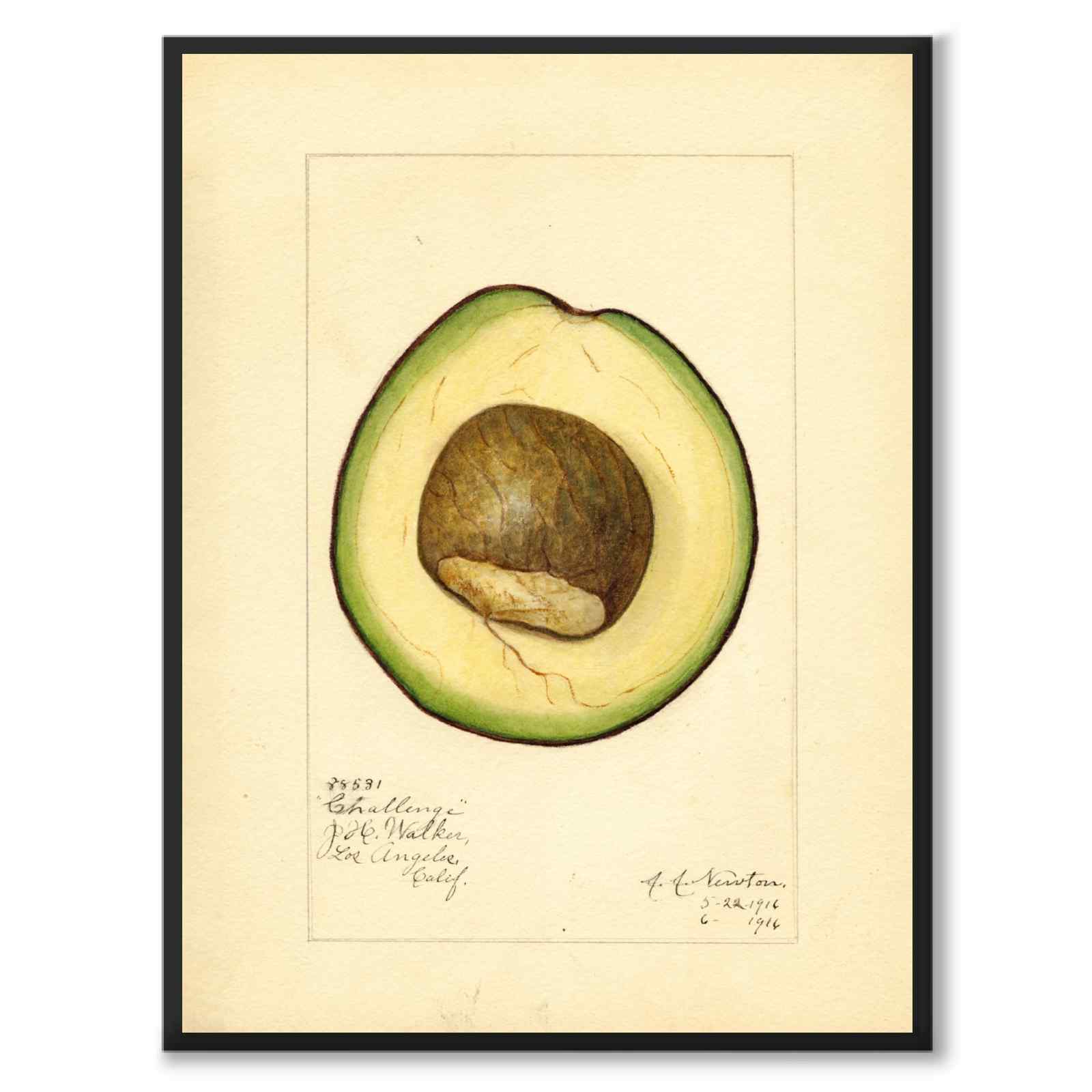 Poster with motif of the illustration Avocado from the 20th century. Avocado, also known as "alligator pear" because of its green, scaly skin and rounded shape, is a fruit native to South and Central America.