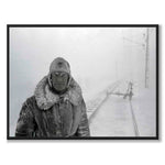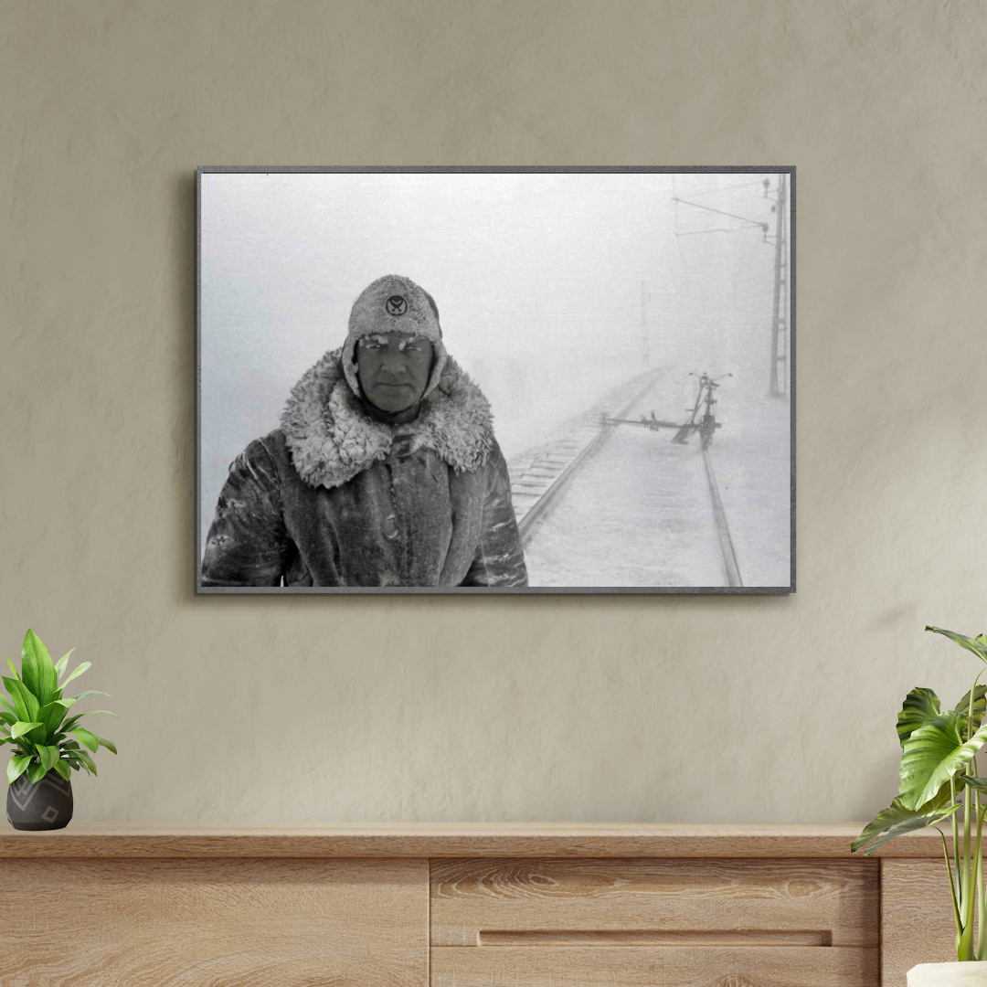 Photography Railway guard, Riksgränsen 1955 shows one of those days with heavy snowfall and low temperature. You can see how the track guard is covered in snow and how the storm makes it difficult to see the remaining parts of the railway.