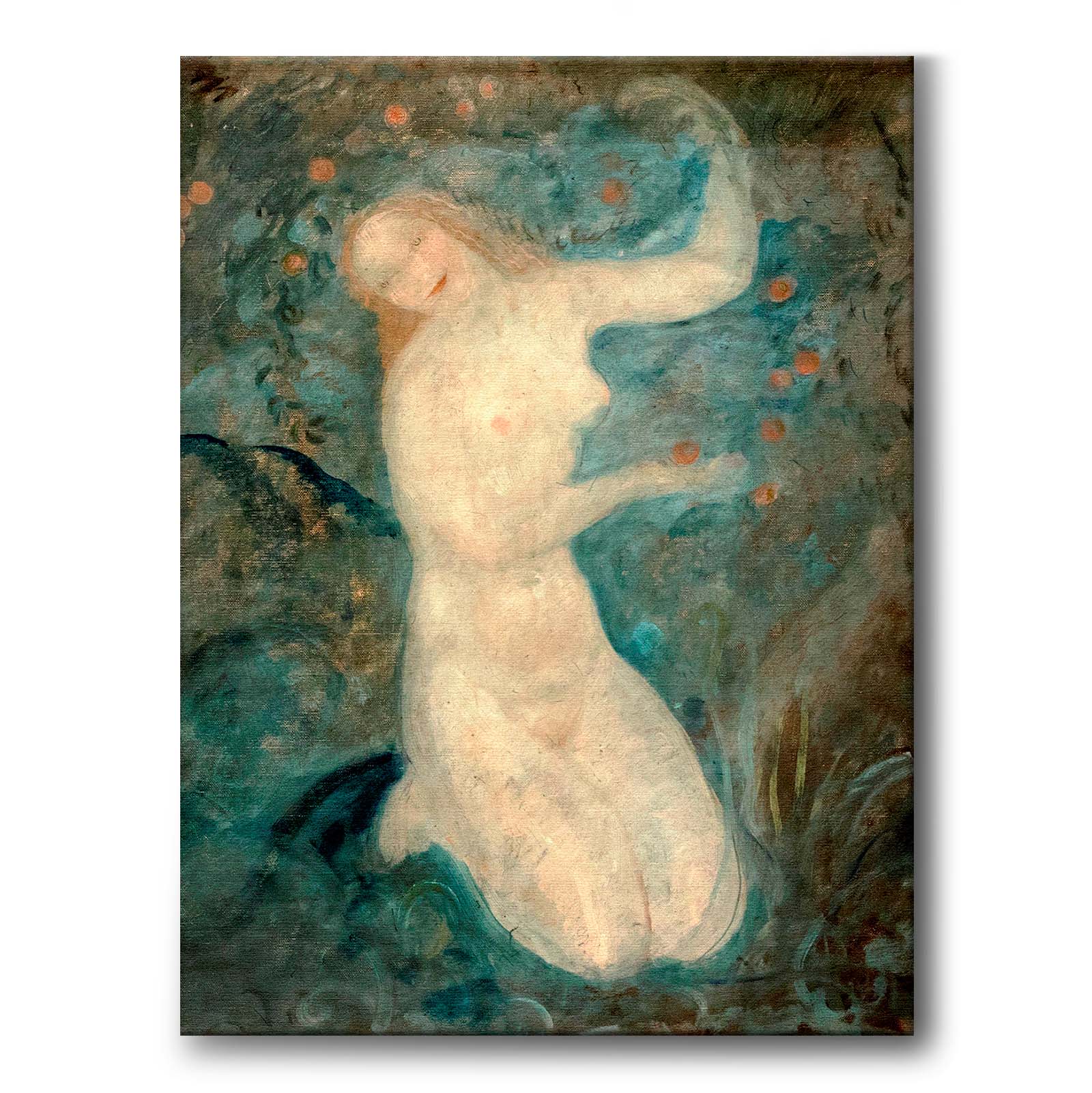 In the picture we see a naked woman kneeling in a diffused landscape of plants in shades of blue. Her gaze is directed towards a black snake on the left. She appears to be picking the fruit hanging from the tree above her. Is it the forbidden fruit in the Garden of Eden? On the hanging frame belonging to the original painting it says: "Blue princess 1918" and "Eve with the snake". The work is known as Blue Eve and is typical of the monumental art that Bauer focused on between 1915-1918 when he resigned as an illustrator for Among Elves and Trolls and wanted to do something new than his classic fairy tale motifs.