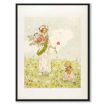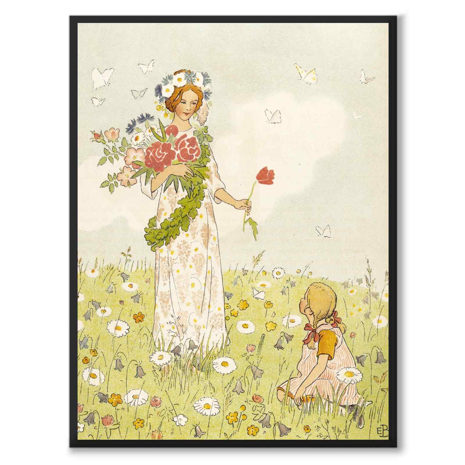 Poster med en vacker illustration från Elsa Beskows barnbok "Blomsterfesten i täppan" som först publicerades 1914.