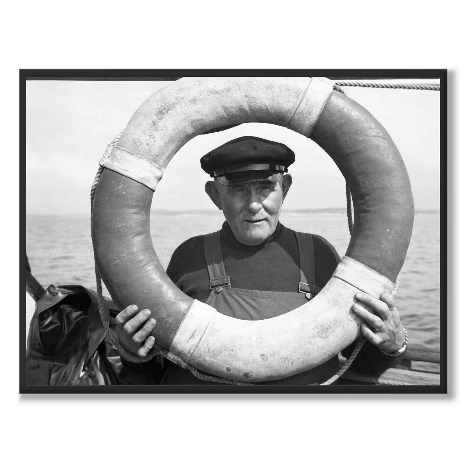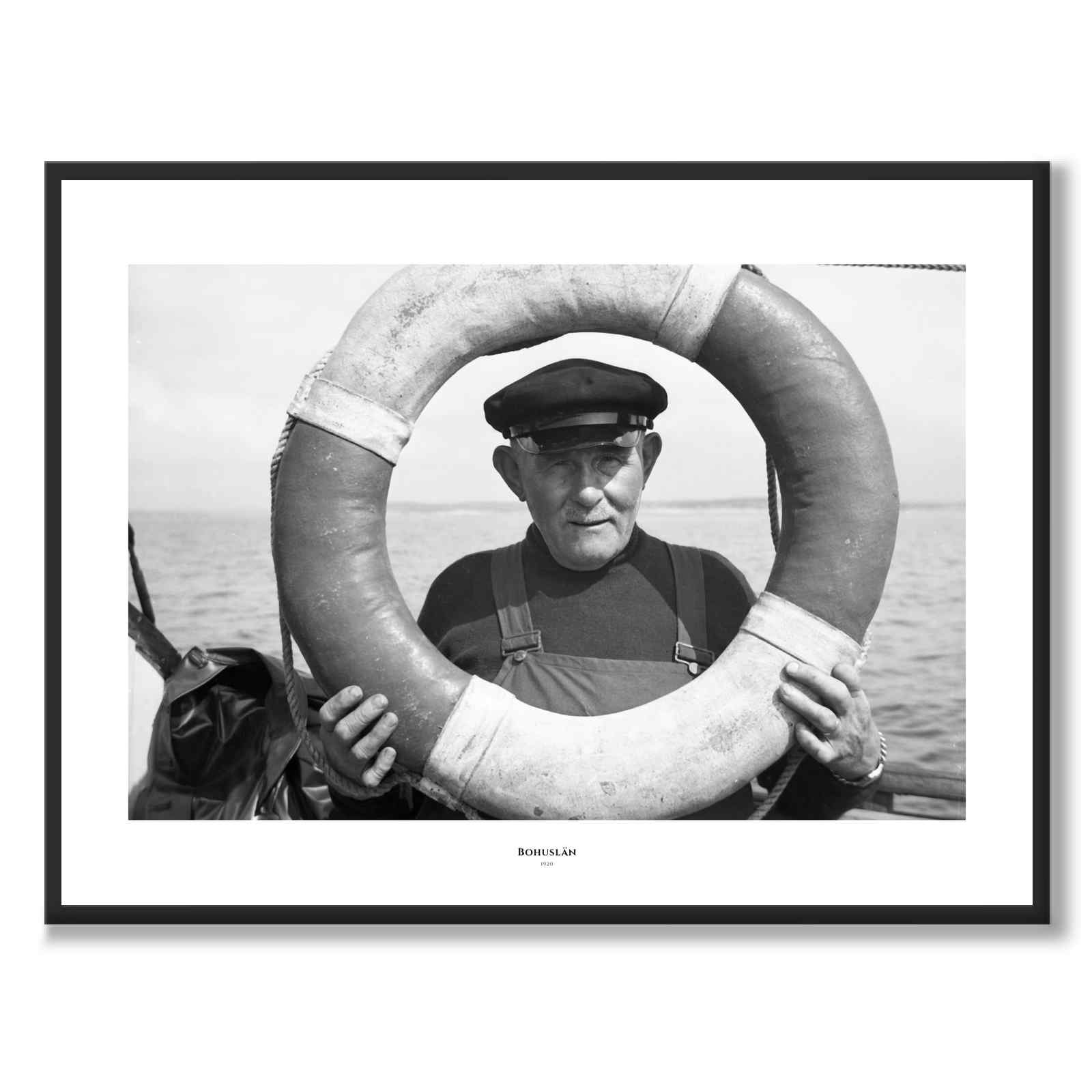 Poster with a beautiful photograph taken by Dan Samuelson in Bohuslän during the 1920s. The picture is a portrait of a fisherman out on the water, where he holds up a lifebuoy as a frame around his face.