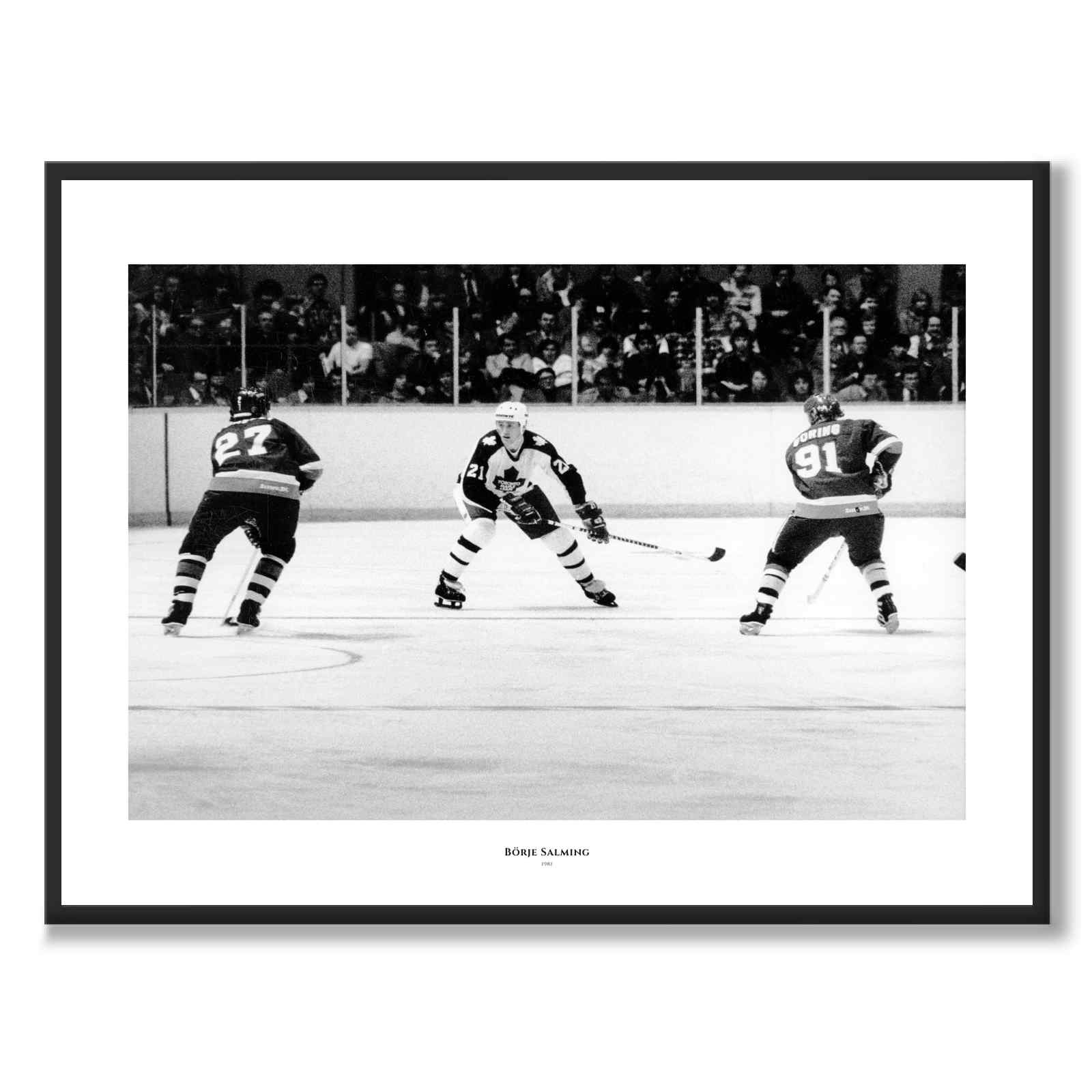 Poster with a vintage photograph of Börje Salming in a Toronto Maple Leafs jersey, number 21, during an NHL game.