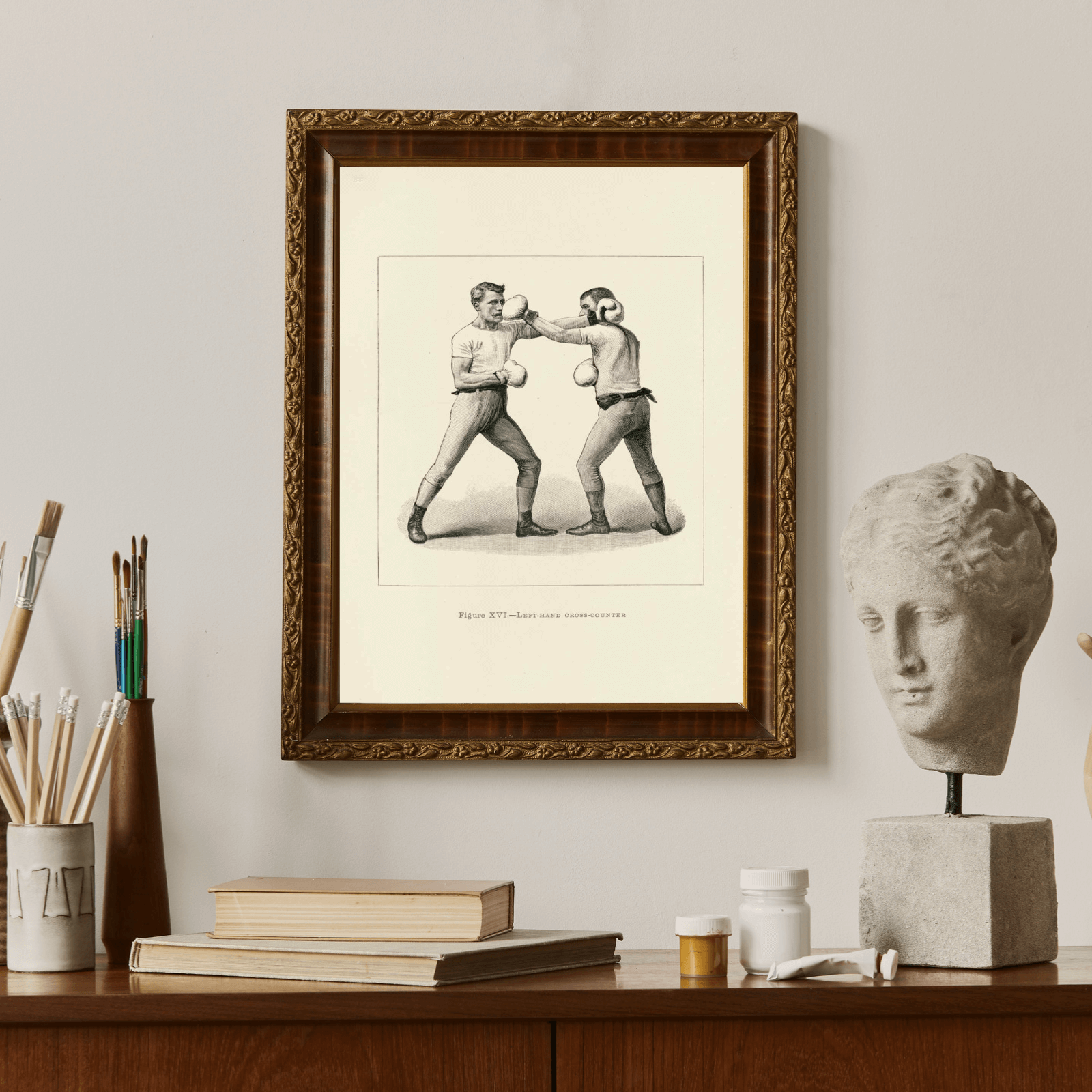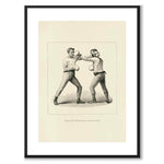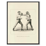 Poster with the illustration Boxing from the literary series The Badminton Library of Sports and Pastimes. In the picture we see a man throwing a left punch to counter his opponent. Below them we see the title text Figure XVI - Left-Hand Cross-Counter.