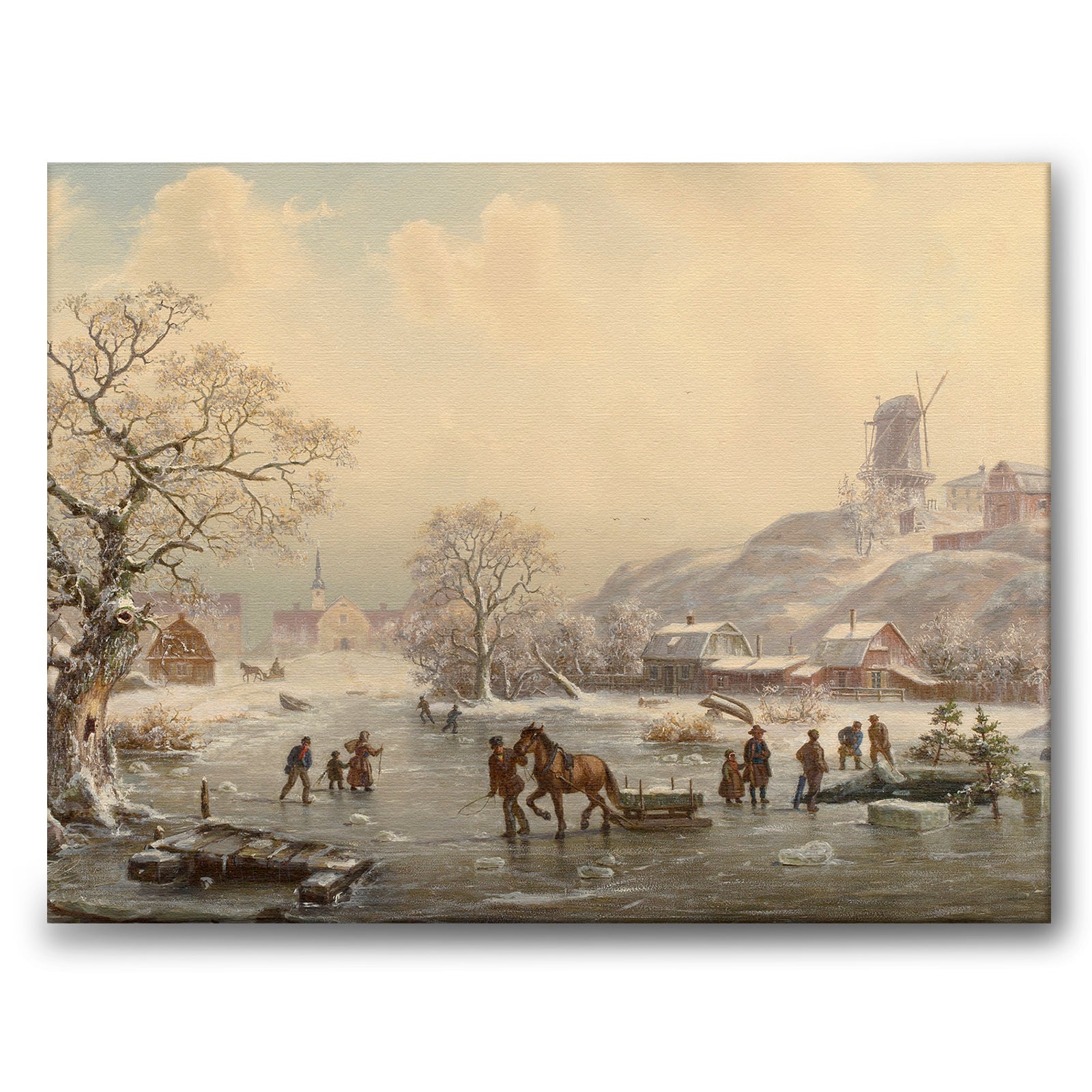 Canvas with the painting Ice sawing on Hammarby lake which shows a contemporary folk life during the 19th century. Blocks of ice were sawed up from frozen lakes in the winter and placed in huge piles covered with thick layers of sawdust. This was enough to preserve the ice throughout the year. The blocks of ice were then delivered to homes by so-called ice men. In homes, the ice blocks were stored in so-called ice cabinets which were common during the 19th century and the first half of the 20th century until the modern refrigerator was introduced and became available to households.