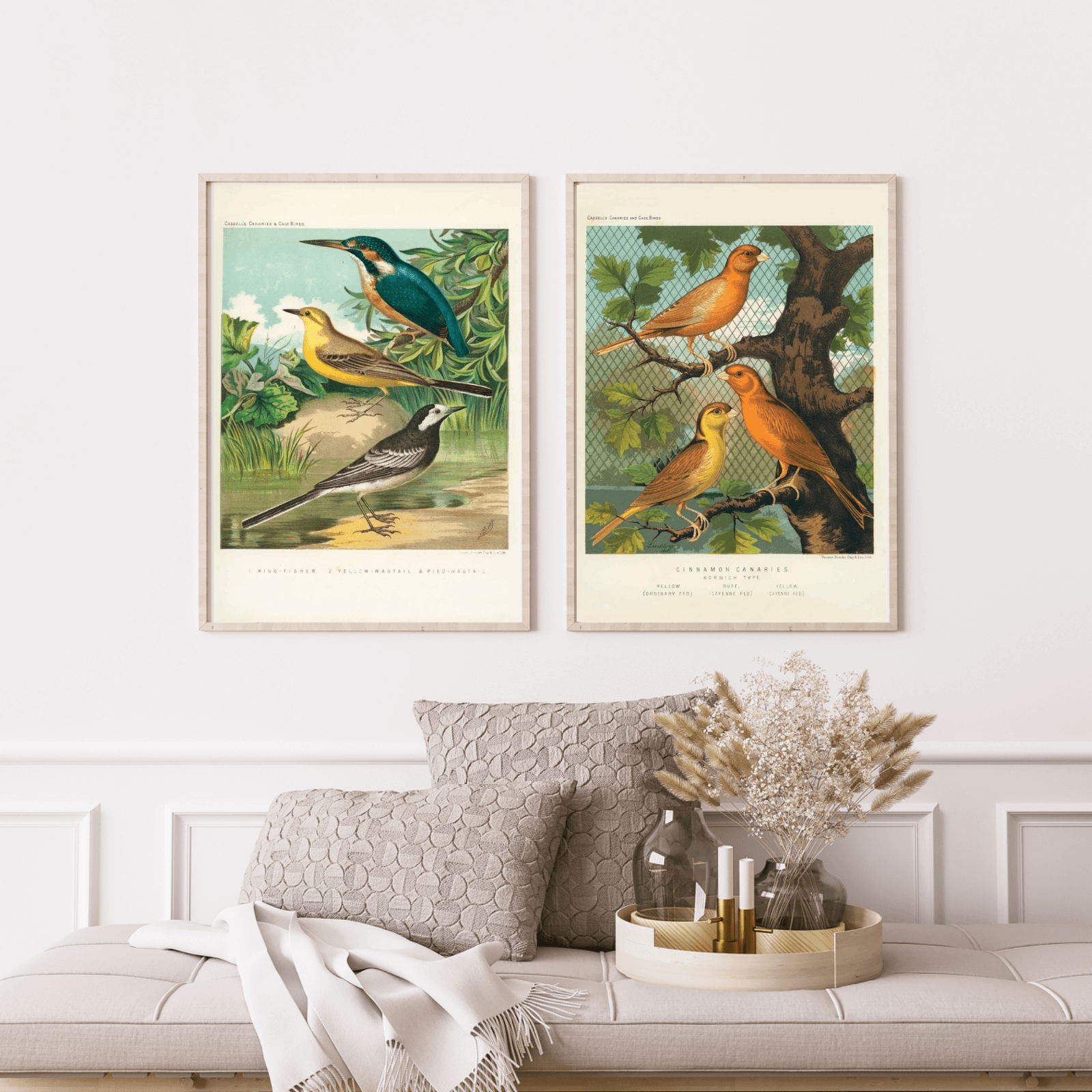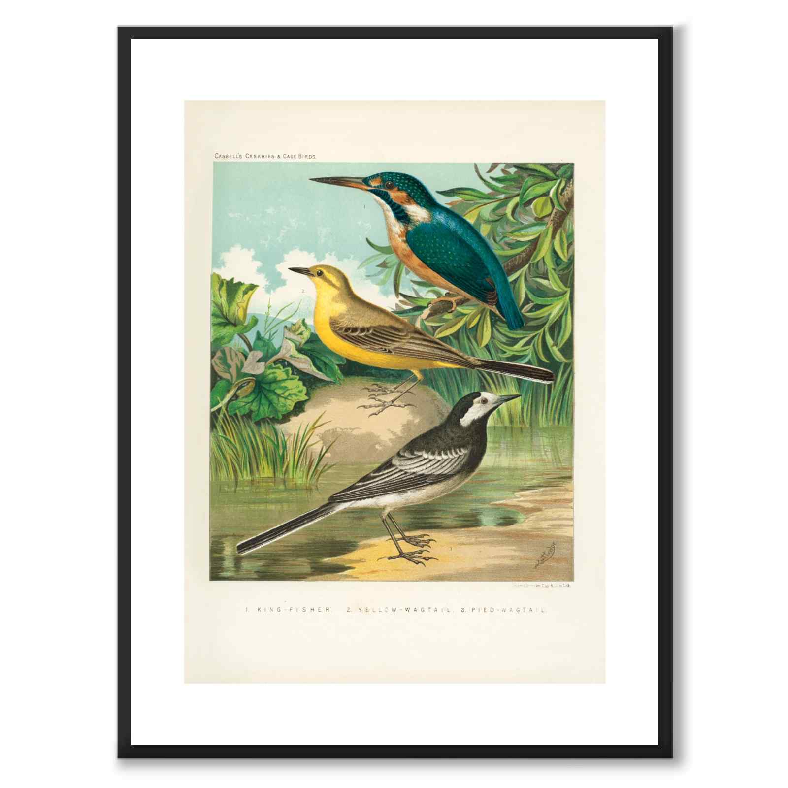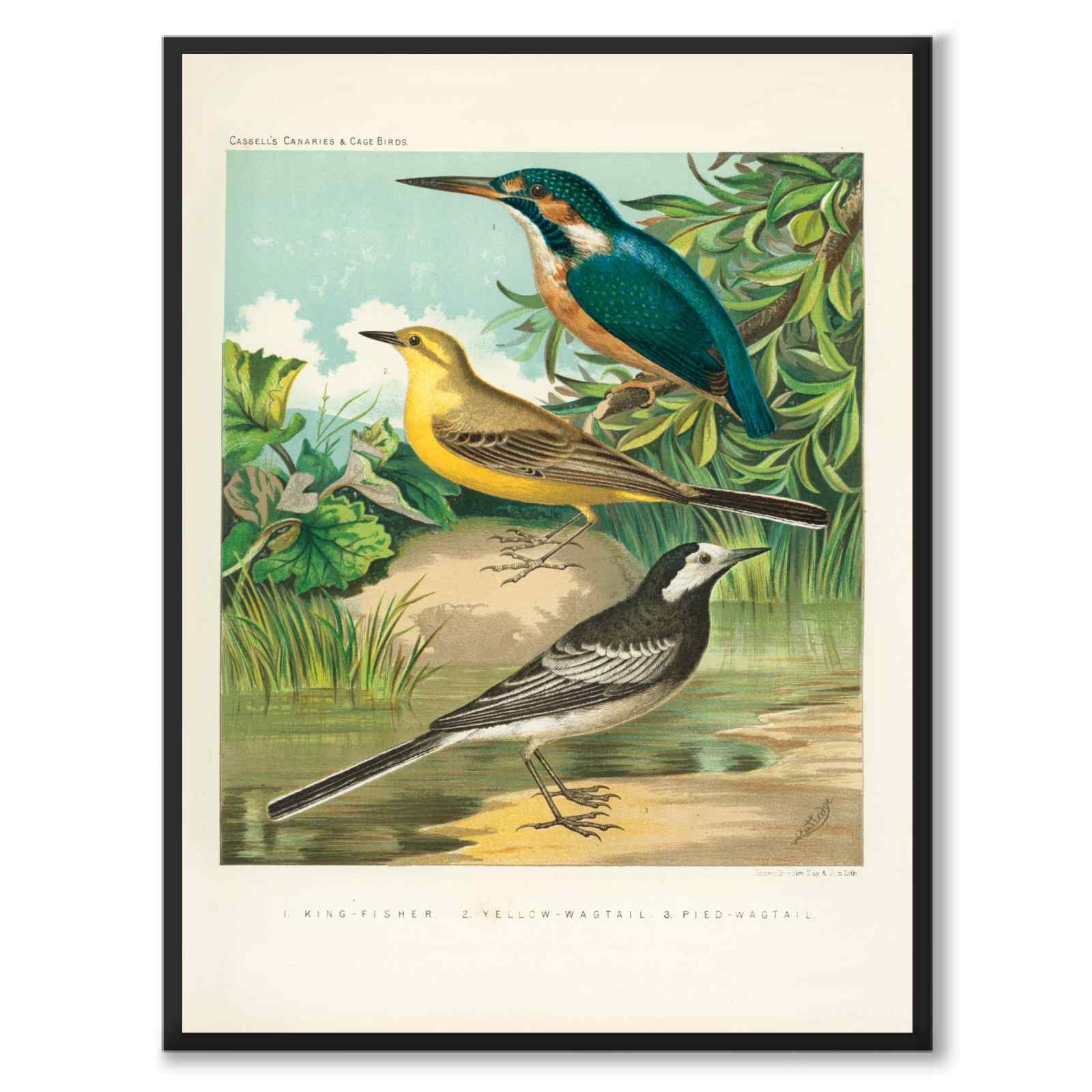 Poster with the illustration Cassel from the book The Illustrated Book of Canaries and Cage-Birds. In this illustration, we see a kingfisher, yellow tern and barn owl.