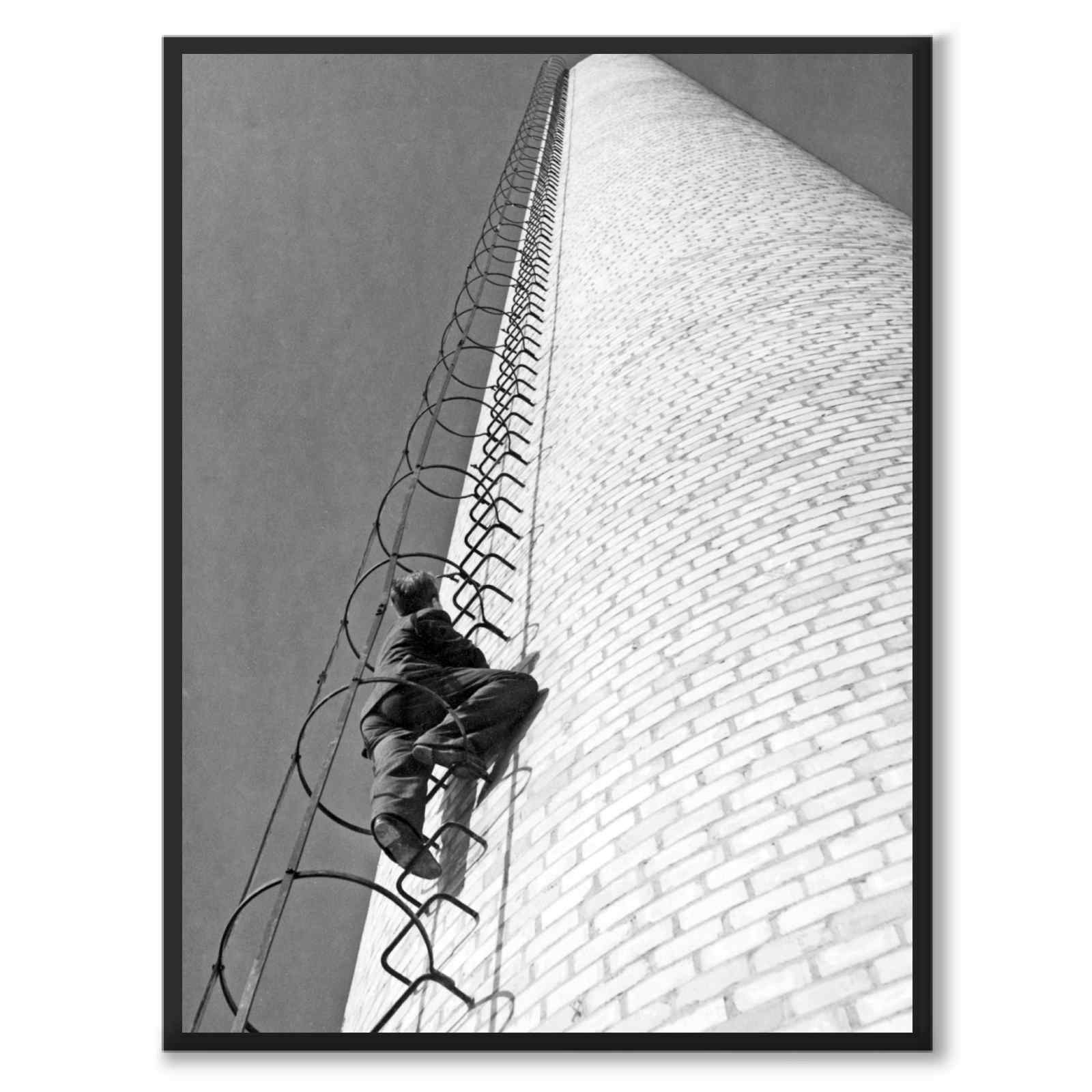 Unique poster with a black and white photograph of a man climbing up a chimney in the 1950s in Sweden. The perspective of the photo gives the viewer an insight into the height of the chimney and how daring the climbing man is.