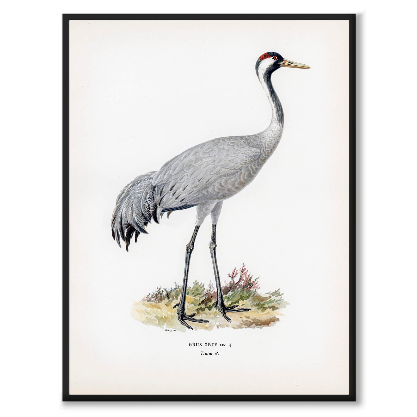 Poster with a beautiful illustration of a crane drawn by the von Wright brothers. The illustration was published at the beginning of the 20th century in the book Svenska Fåglar Efter Naturen Och På Sten Ritad . In the picture we see, among other things, the text Grus Grus - Latin for the name of the species . The crane is Västergötland's landscape animal and landscape bird.