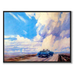 The image captures a scene where we see a blue car from behind driving along a country road. The background is calm, with a blue sky and a few white clouds.