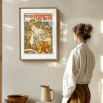 The poster is advertising for a bicycle brand. The image shows a woman standing by a bicycle, surrounded by swirling hair and decorative lines.