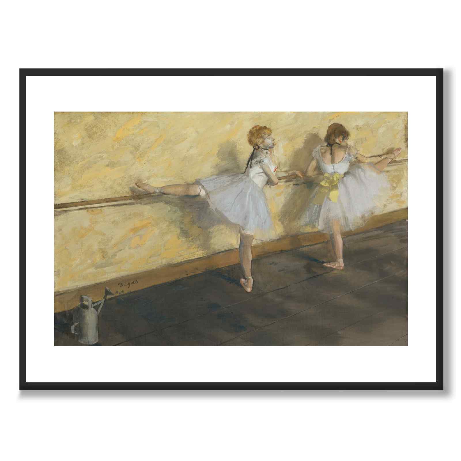 A fantastic poster featuring the painting Dancers Practicing at the Barre created in 1877 by the iconic artist Edgar Degas, whose signature we can see on the wall molding in the painting.