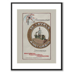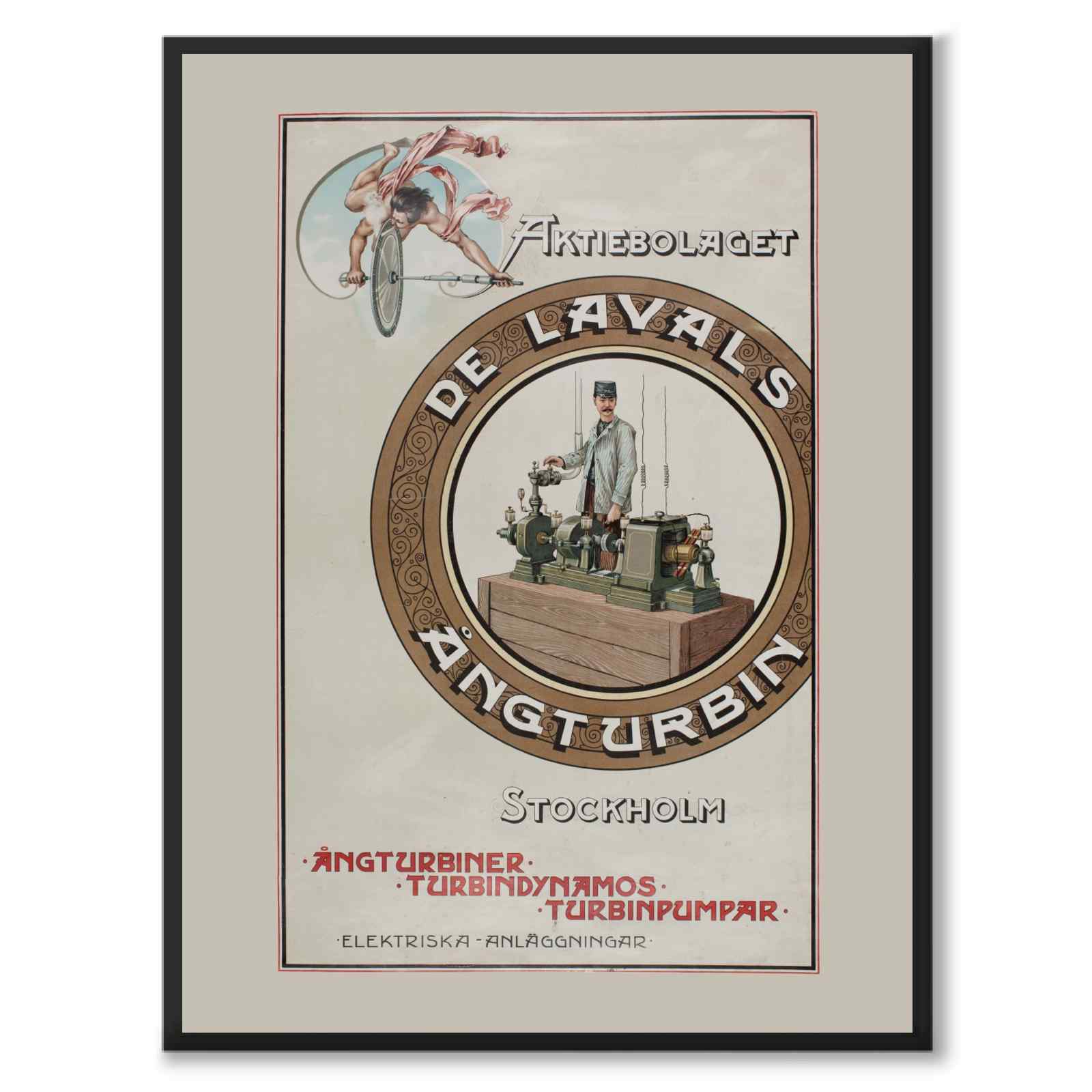 Poster with an illustration from the year 1895 marketing AB De Laval's steam turbine and turbine pump in Stockholm, Sweden. The poster is a color lithograph, printed by Kunstdruck Kaufmann in Berlin and gives an insight into the industrial development of the time.