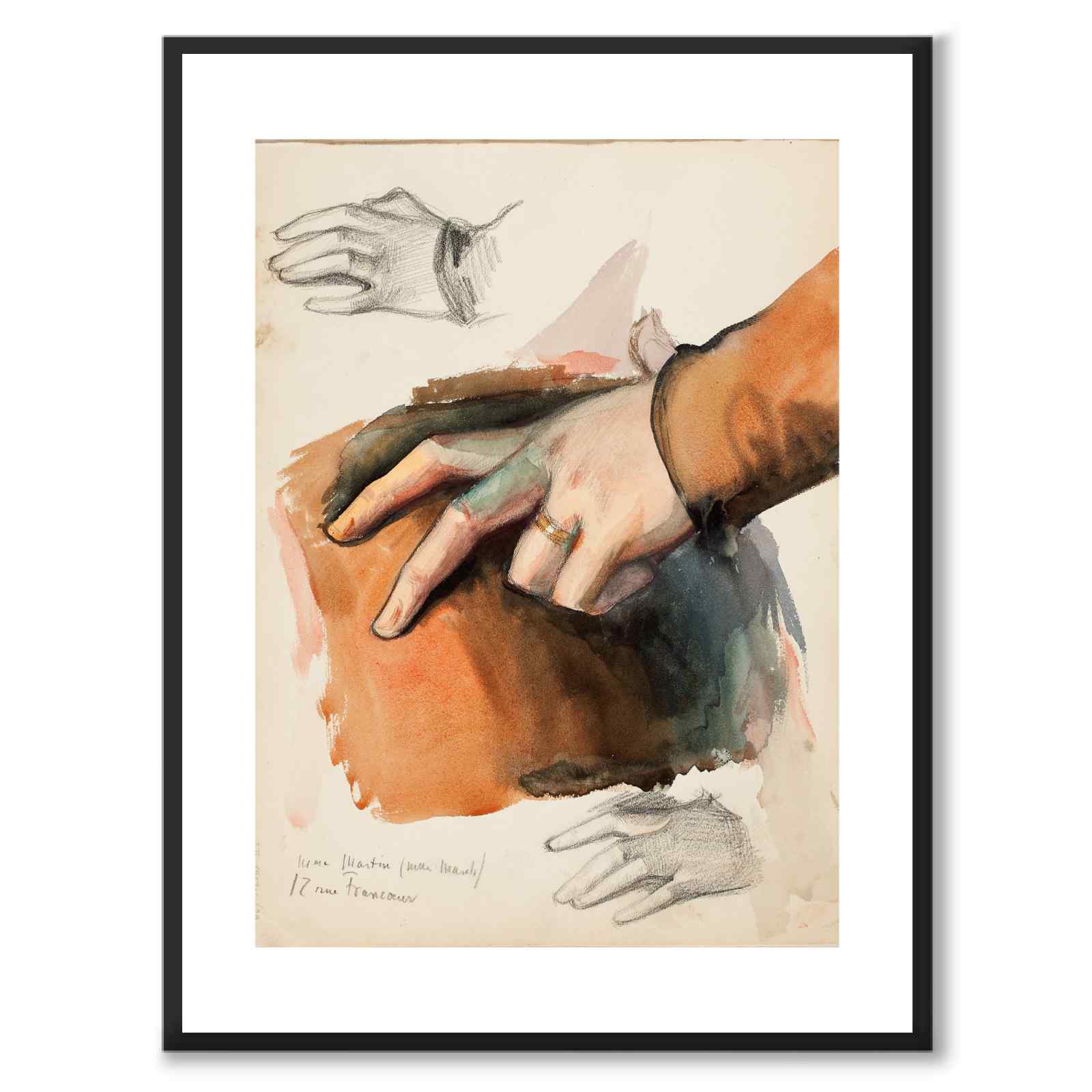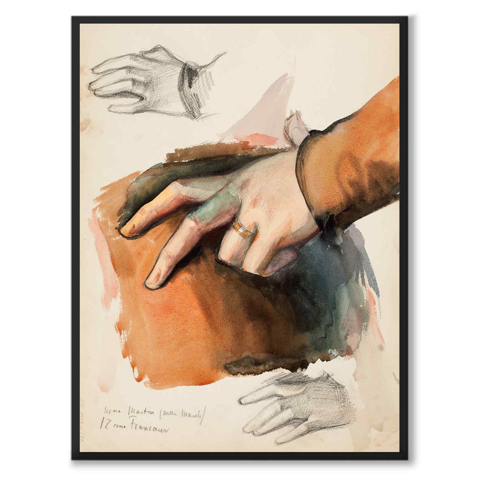 Poster with the beautiful sketch Detail study of a hand, created by Albert Edelfelt. The image is part of a larger collection of sketches of hands.