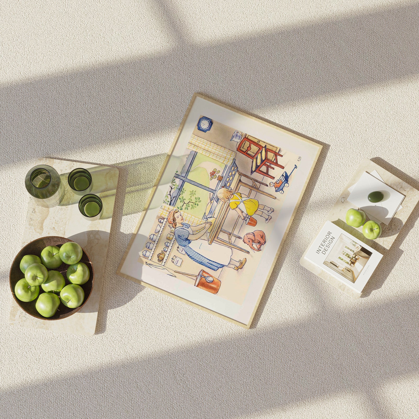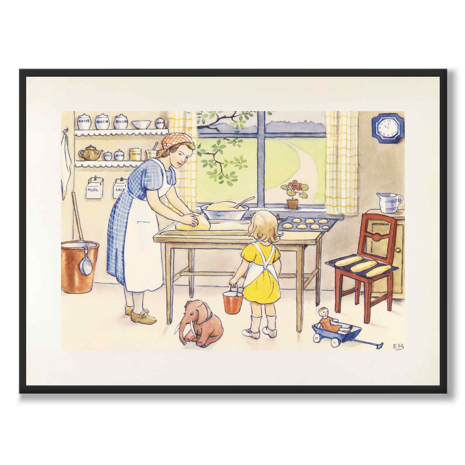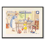 In this illustration we see Annika standing in the kitchen while her mother bakes bread. In the background we see toys and some crockery on a kitchen shelf.