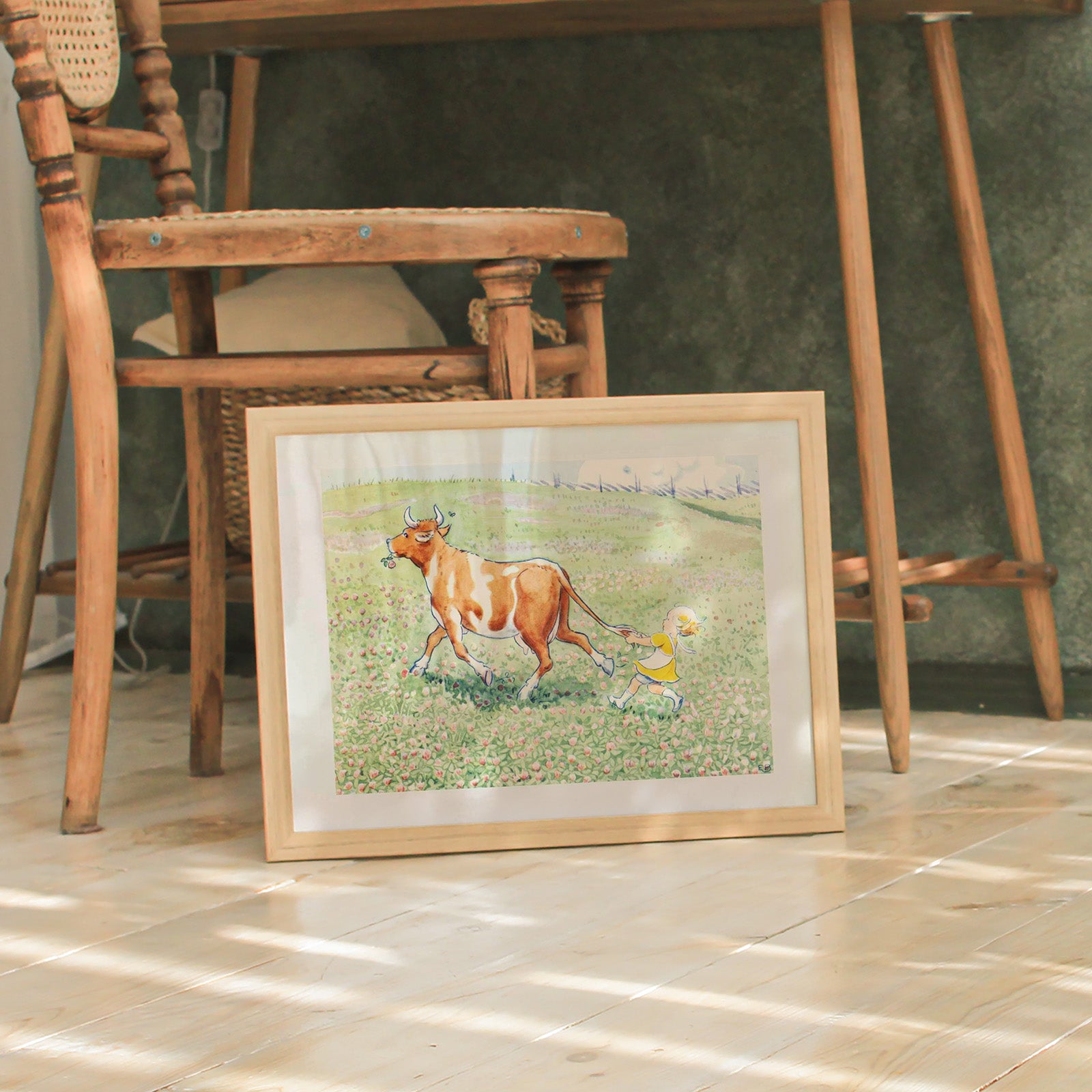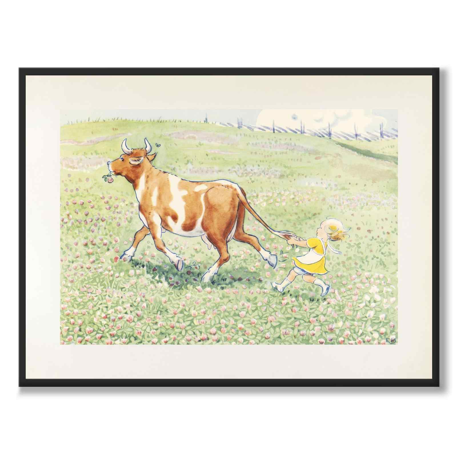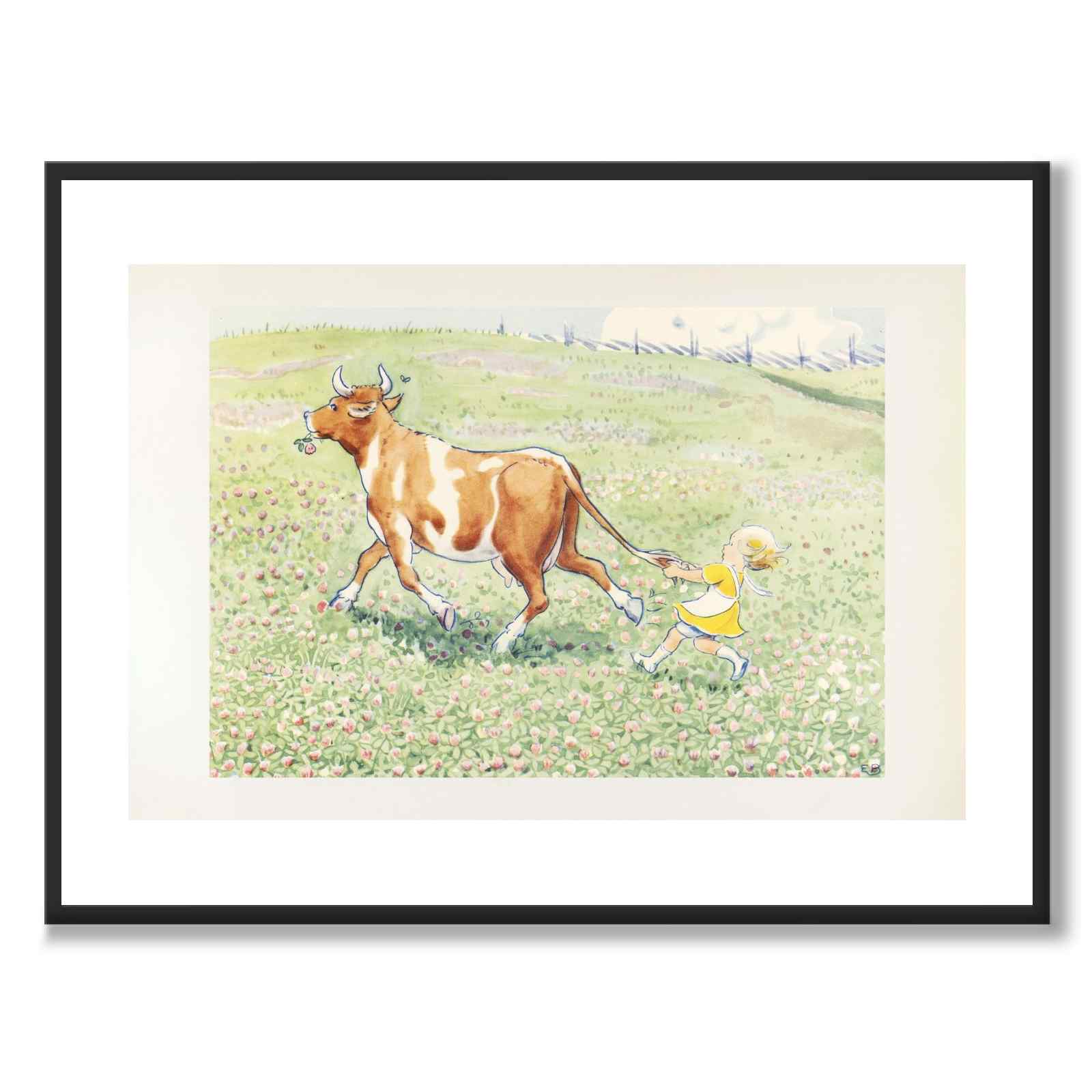 Poster with an illustration from Elsa Beskow's picture book "Duktiga Annika" which was published in 1941. The book is about Annika, a kind and talented girl who helps look after the cow Majros.