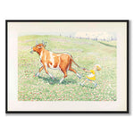 In this illustration we see the cow Majros on the run with a rose in her mouth, while Annika rushes after her and tries to make her stop.