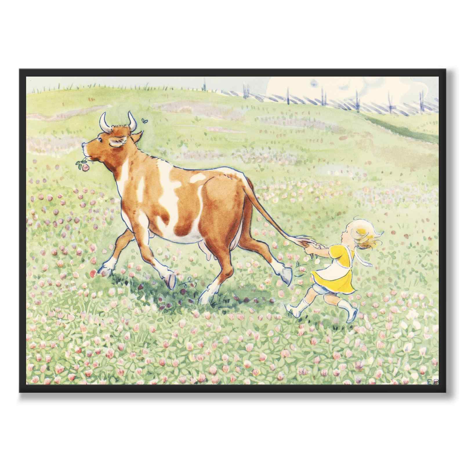 Poster med en illustration från Elsa Beskows bilderbok "Duktiga Annika" som utgavs år 1941. Boken handlar om Annika, en snäll och duktig flicka som hjälper till att passa kossan Majros.