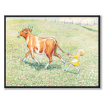 I denna illustration ser vi kossan Majros på språng med en ros i munnen, medan Annika rusar efter och försöker få henne att stanna.
