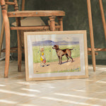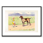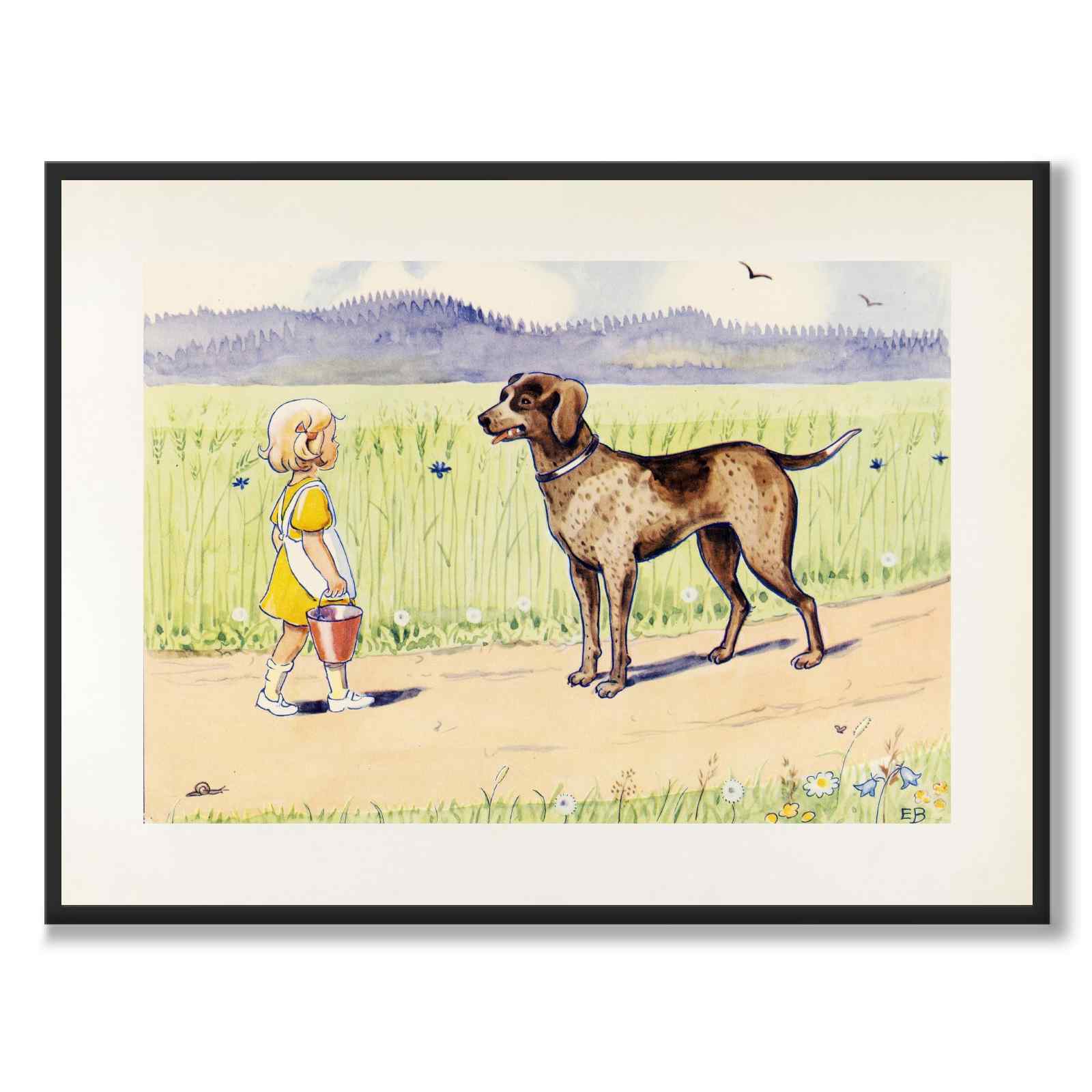 In this illustration we see Annika running into the brown dog that appears in the book sometimes. Annika looks like she is on her way somewhere, with the red bucket in one hand.