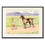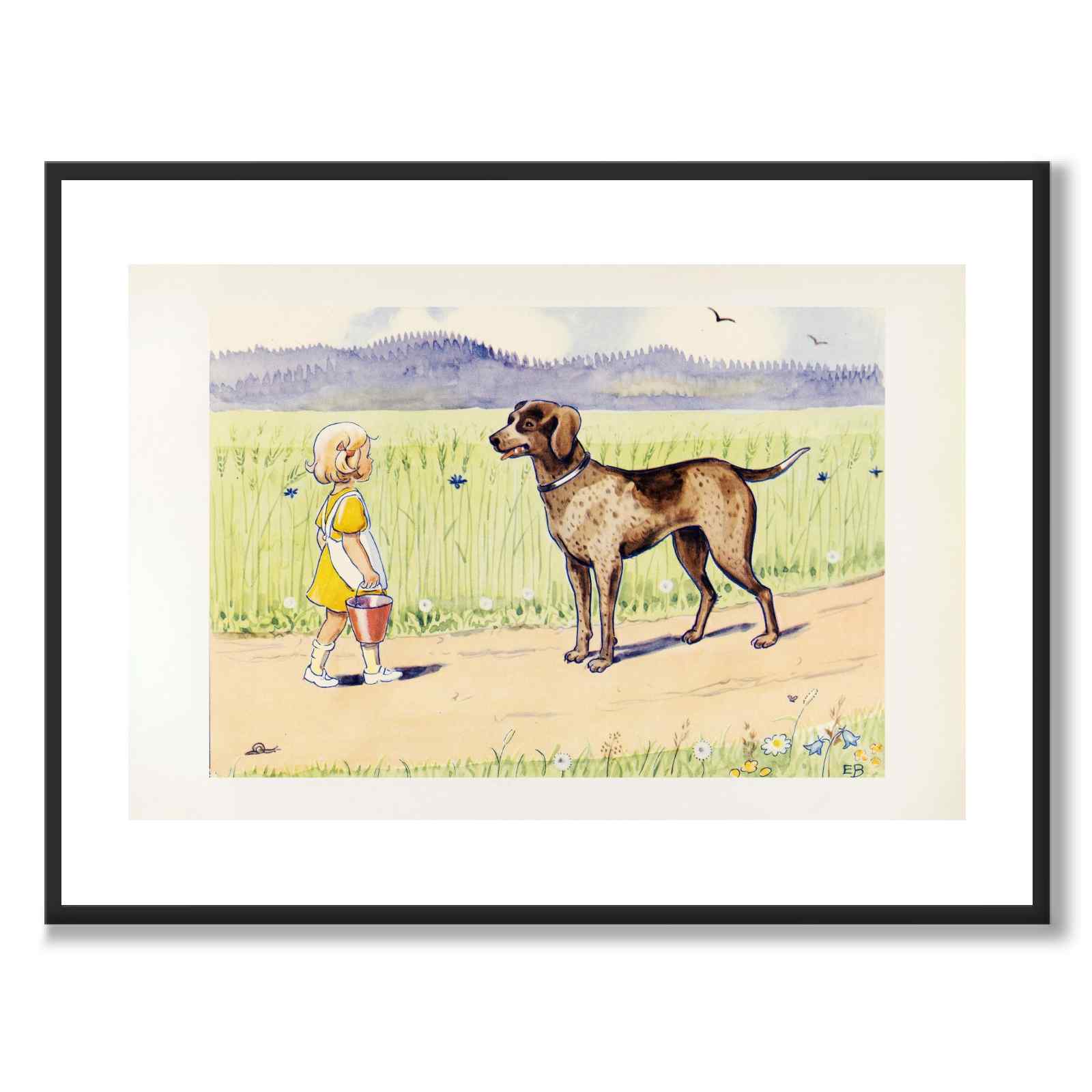 Poster with an illustration from Elsa Beskow's picture book "Duktiga Annika" which was published in 1941. The book is about Annika, a kind and talented girl who helps look after the cow Majros.