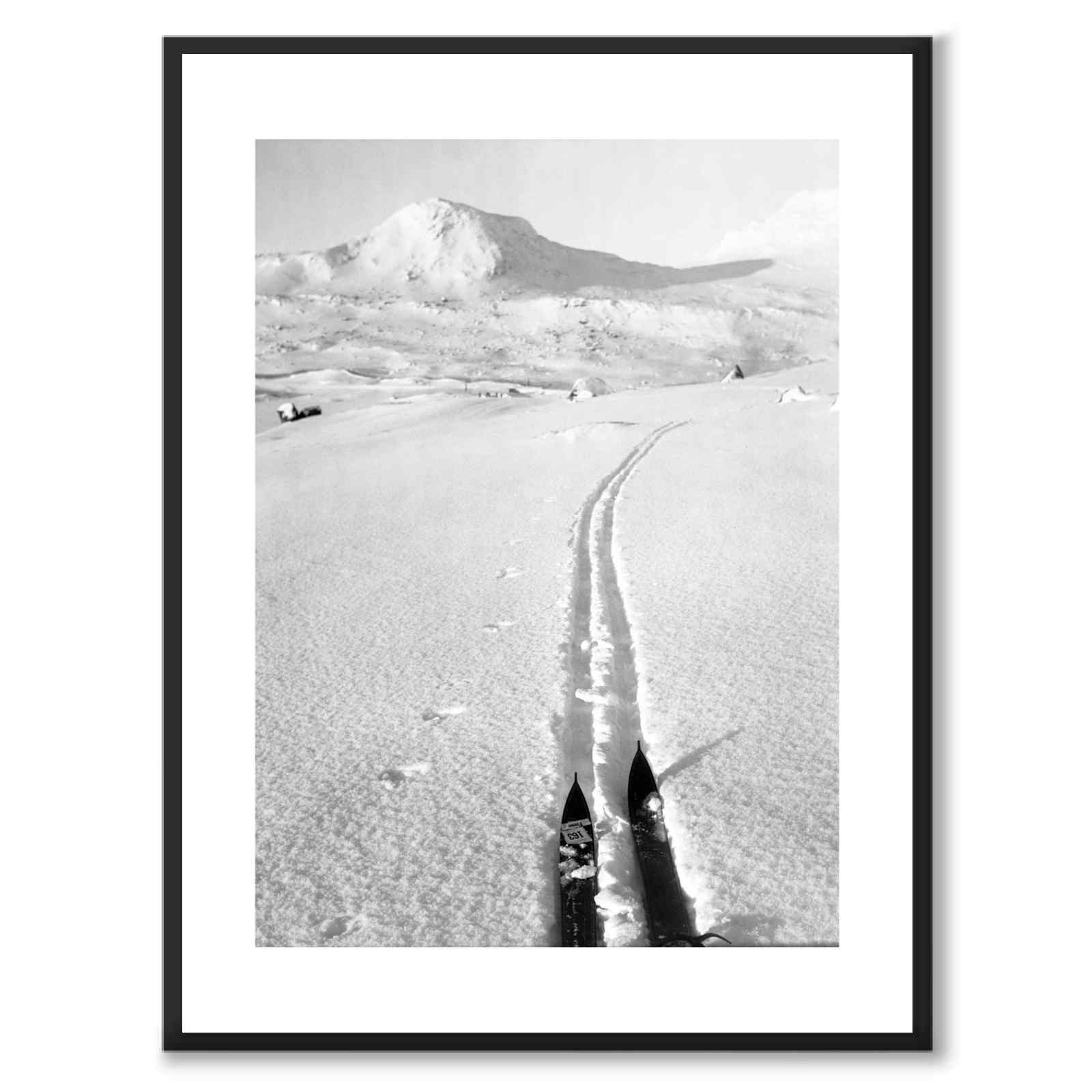 Poster with a photograph of a ski track in a wintry Norwegian landscape. The photo was taken by Anders Beer Wilse.