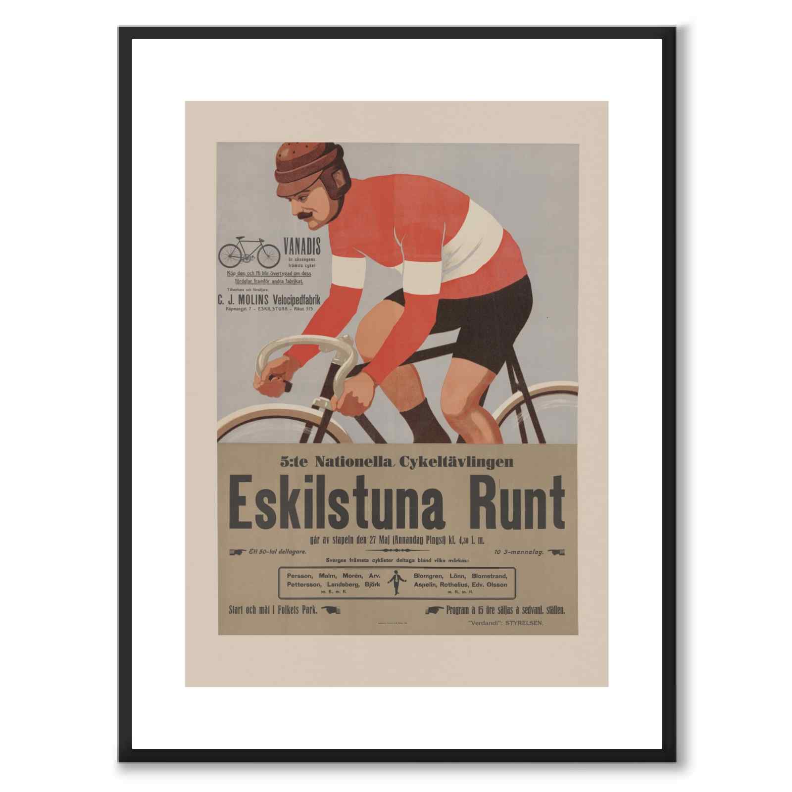 Poster with a vintage poster for the Eskilstuna Runt, the 5th national cycle race which took place on 27 May 1912. The poster also clarifies that the date is Whit Monday.