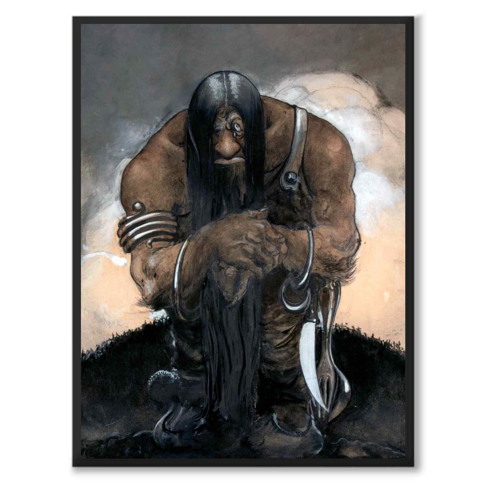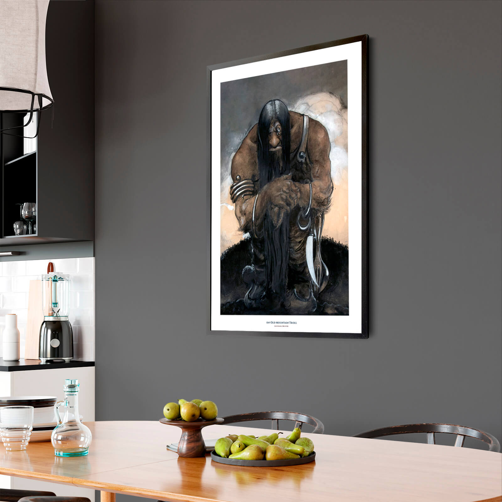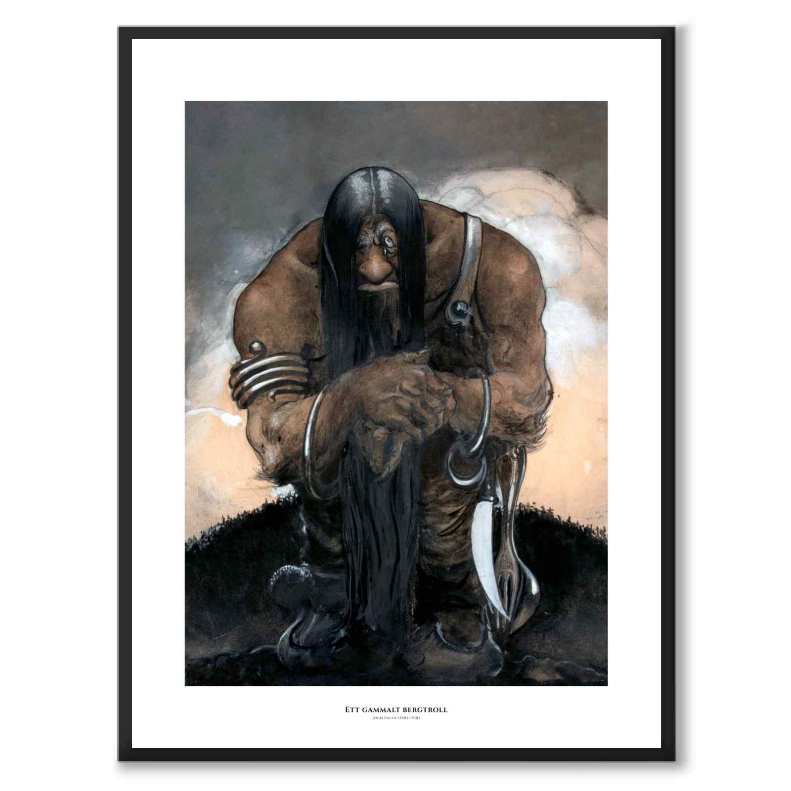 Poster with the painting An Old Mountain Goblin by John Bauer from 1904. A trole from the mountains with long dark hair standing on a forested mountain. On the arms hang bangles as well as a knife, fork and a spoon. The painting was one iillustration to Gustaf Fröding's poem An old mountain troll i The Snowflake: the children's Christmas magazine.