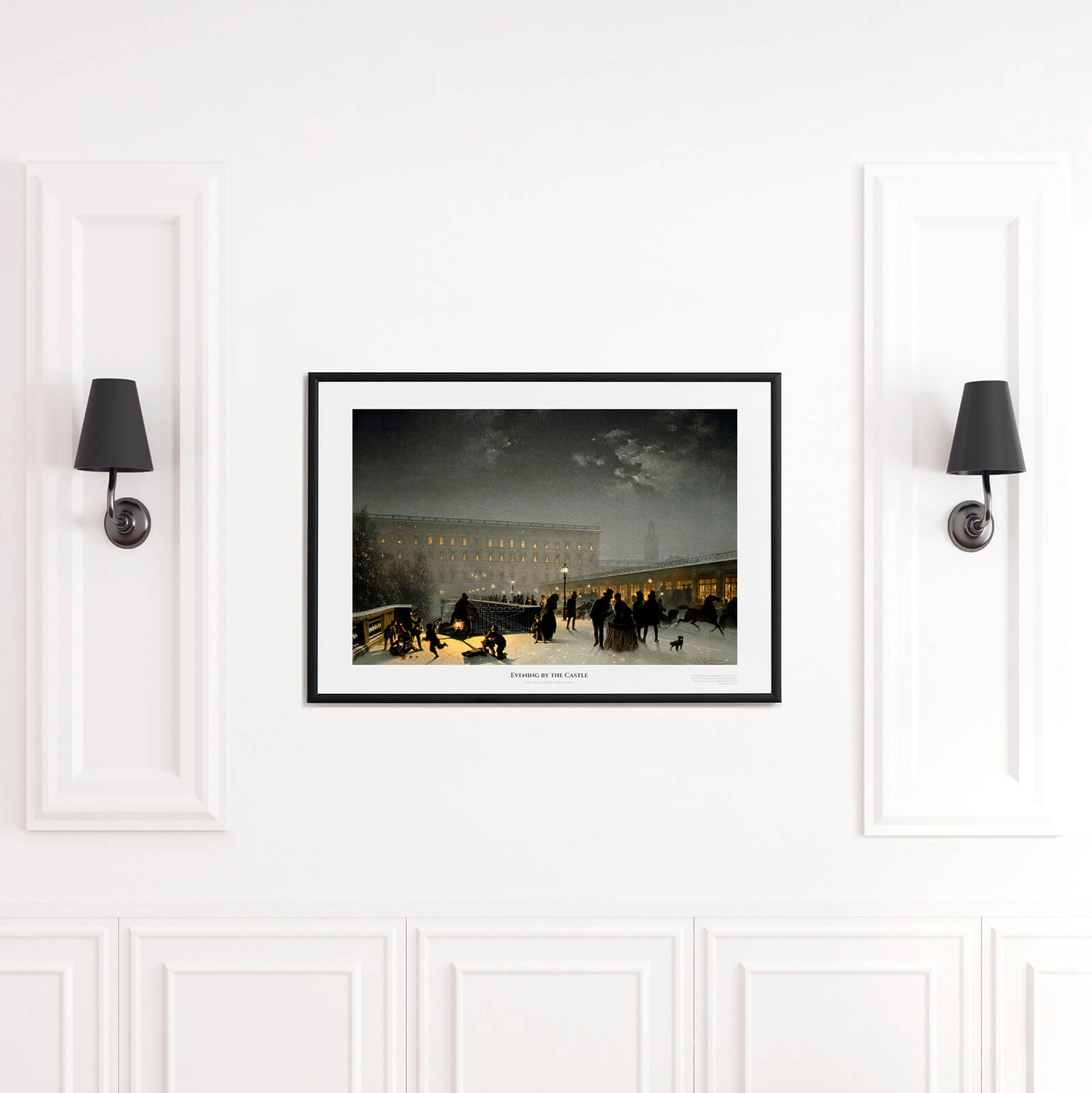 Winter at Norrbro by Stockholm Palace in the 1860s, a central meeting place for people during this time period. The painting shows contemporary folk life with children playing, horse and sleigh. The latest modern gas light seen in the picture was lit at Norrbro in 1853.
