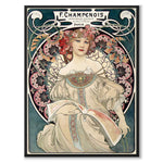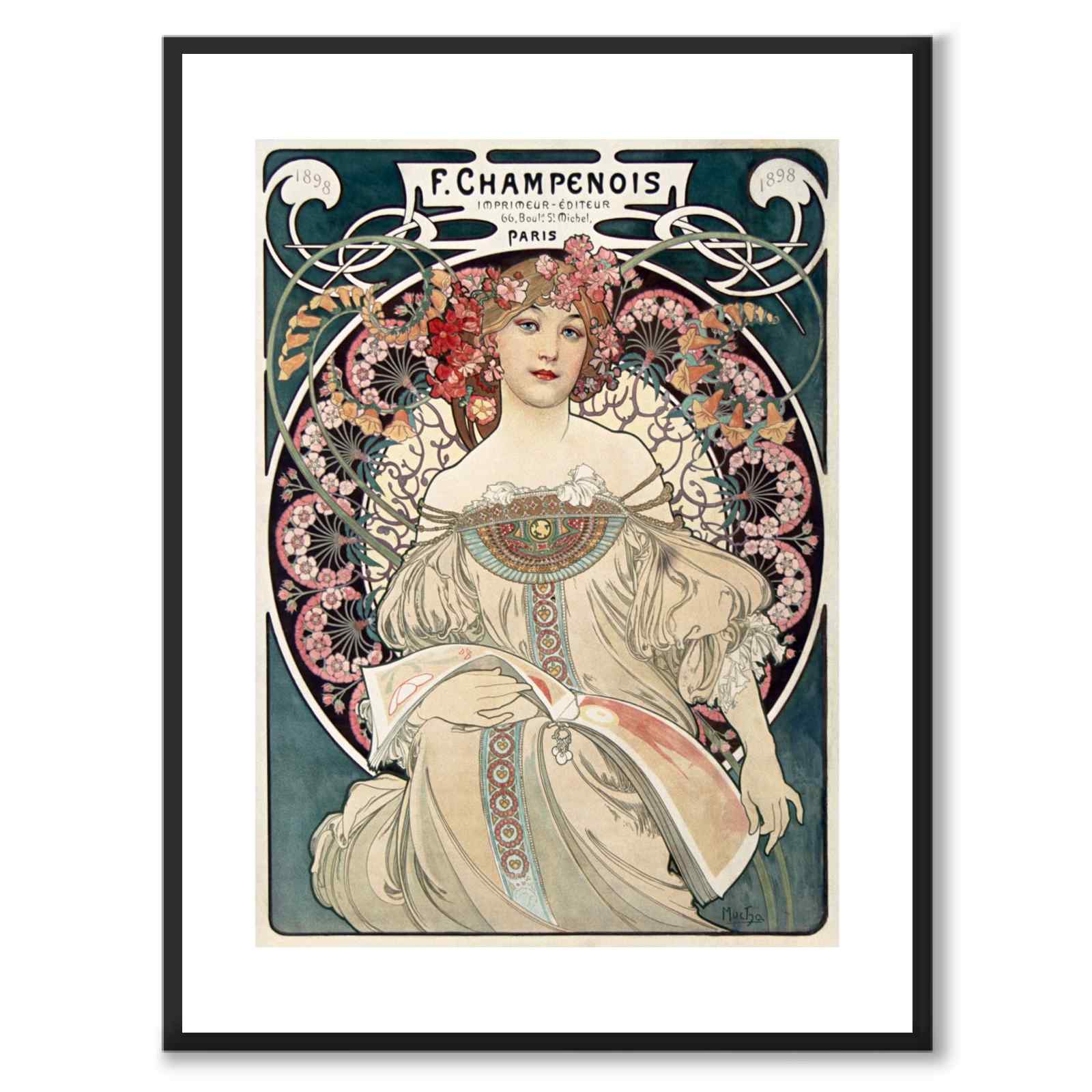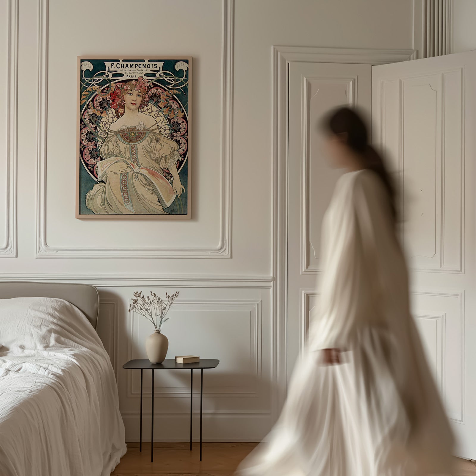 Poster with the poster "F. Champenois" by Alphonse Mucha (1860-1939) created in 1898. The painting shows a woman wearing a white dress and a wreath of flowers in her hair. Around her are decorative details such as flowers and lines, typical of the Art Nouveau style.