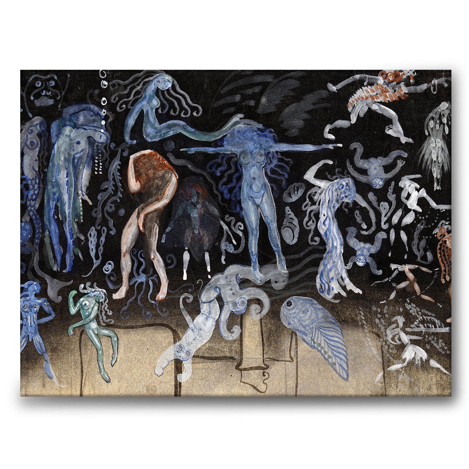 Canvas with the painting Fanstyg by John Bauer from 1915. On a gray background that darkens at the top are lots of small figures; blue, green and pink nude people; fish and shellfish.