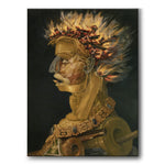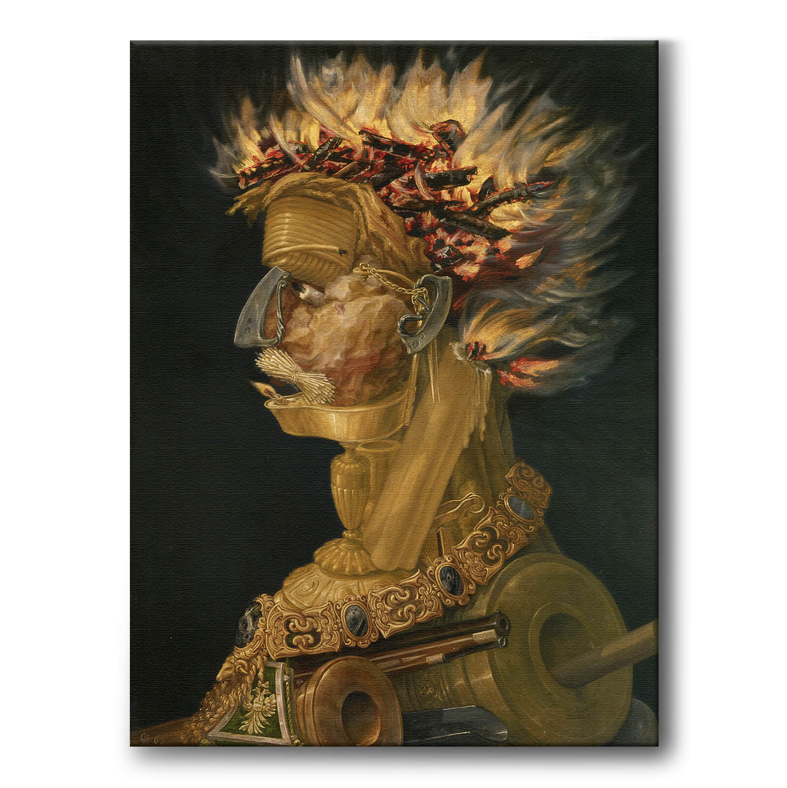 Canvas with the painting "Fire" by the Italian Renaissance painter Giuseppe Arcimboldo (1527-1593) who is known for his imaginative portraits where he uses objects such as fruit, flowers and books to recreate faces.