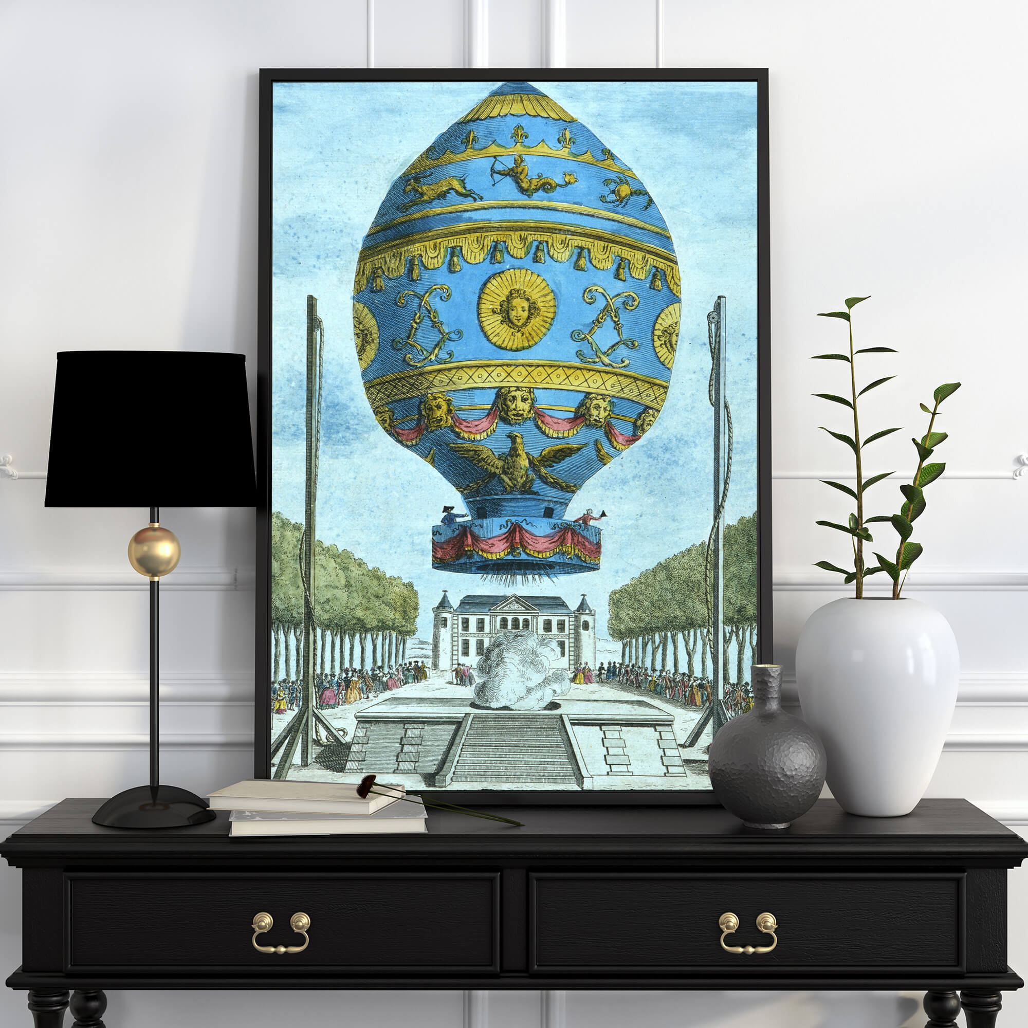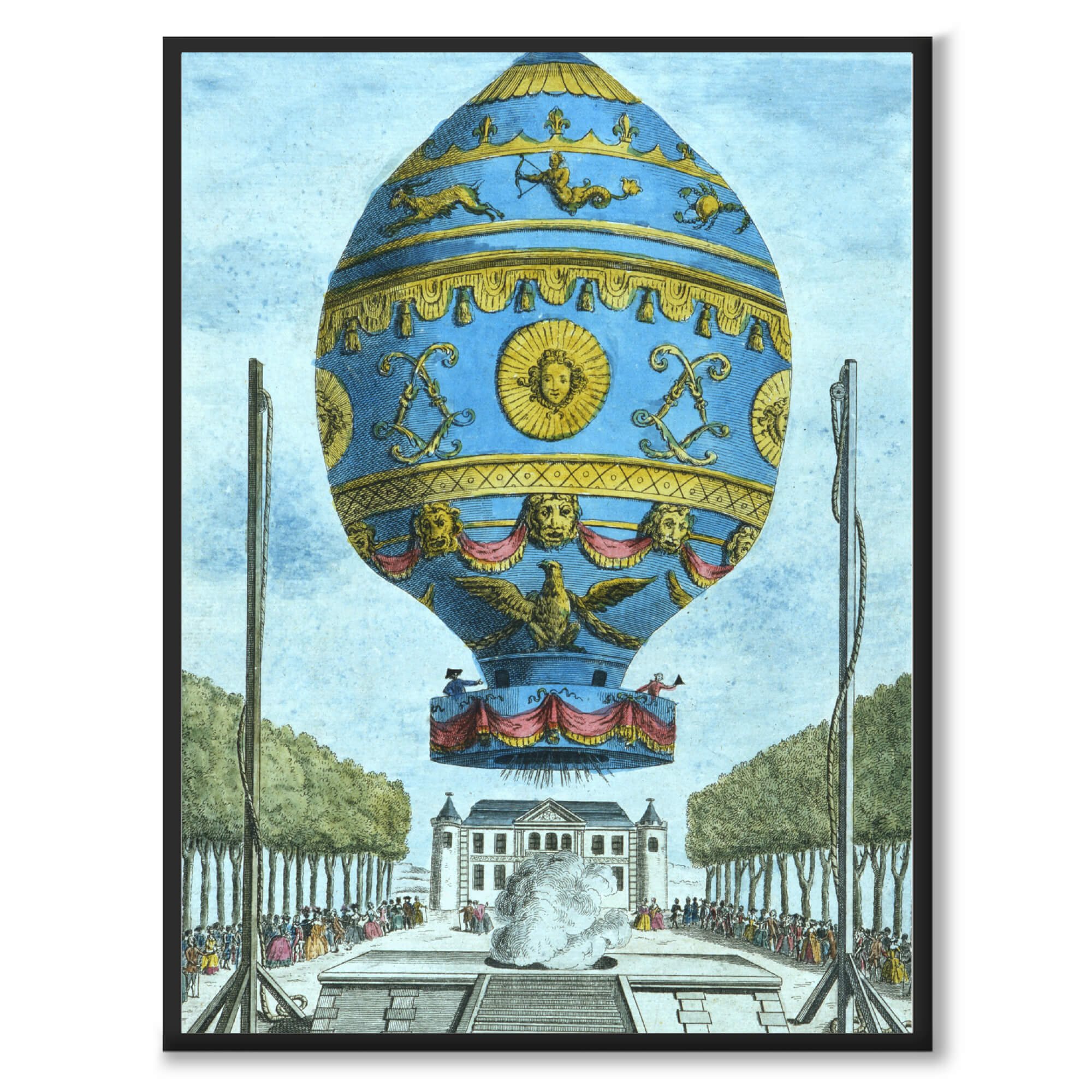 Poster with a captivating depiction of the first-ever manned hot air balloon flight in 1783 near Paris. The balloon, adorned in blue and yellow, was a pioneering 850-kilogram hot air balloon crafted entirely from paper.