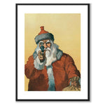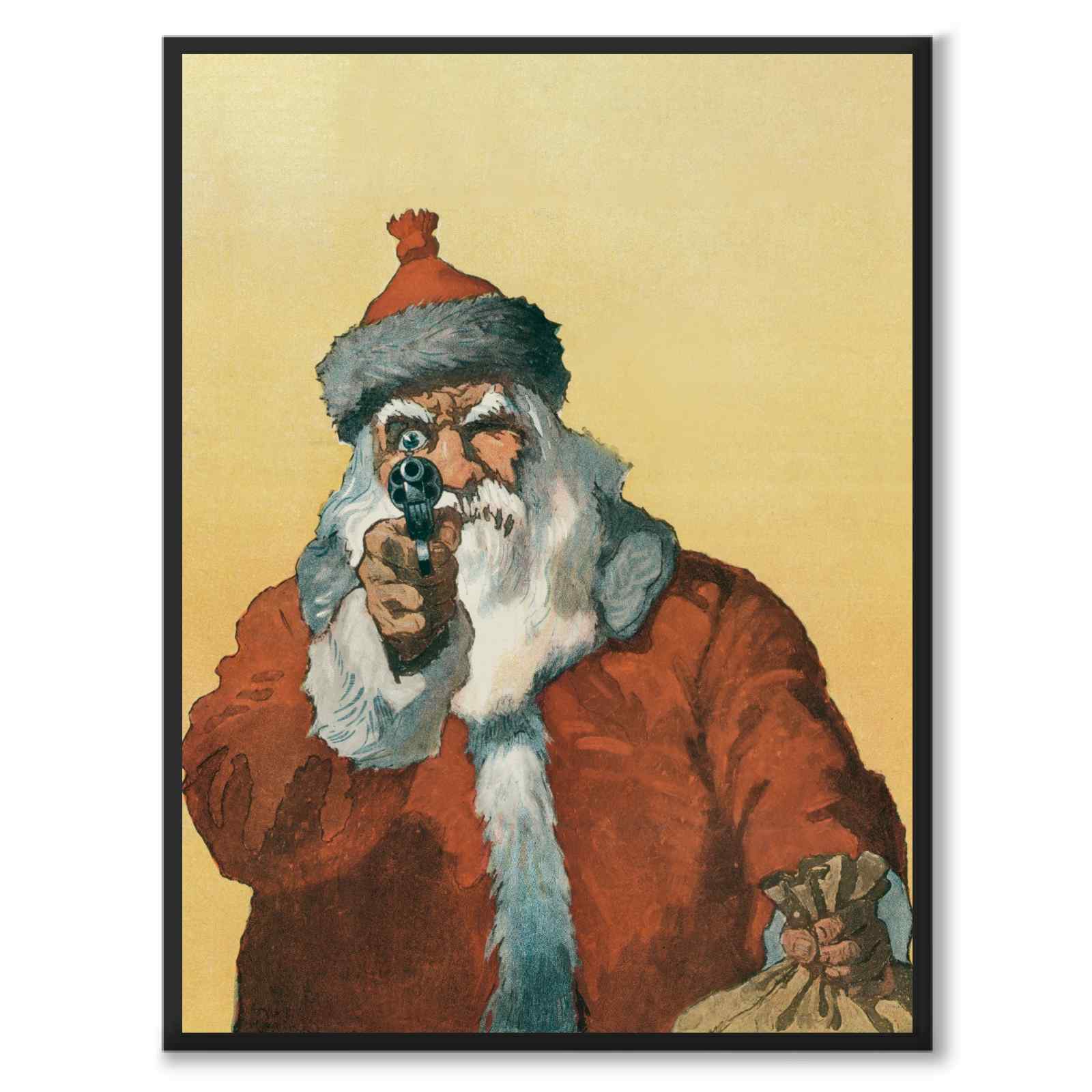 The image shows a Santa who appears to have robbed a store of some sort for valuables that he holds in a bag in his left hand, and in the other he points a gun at the viewer.