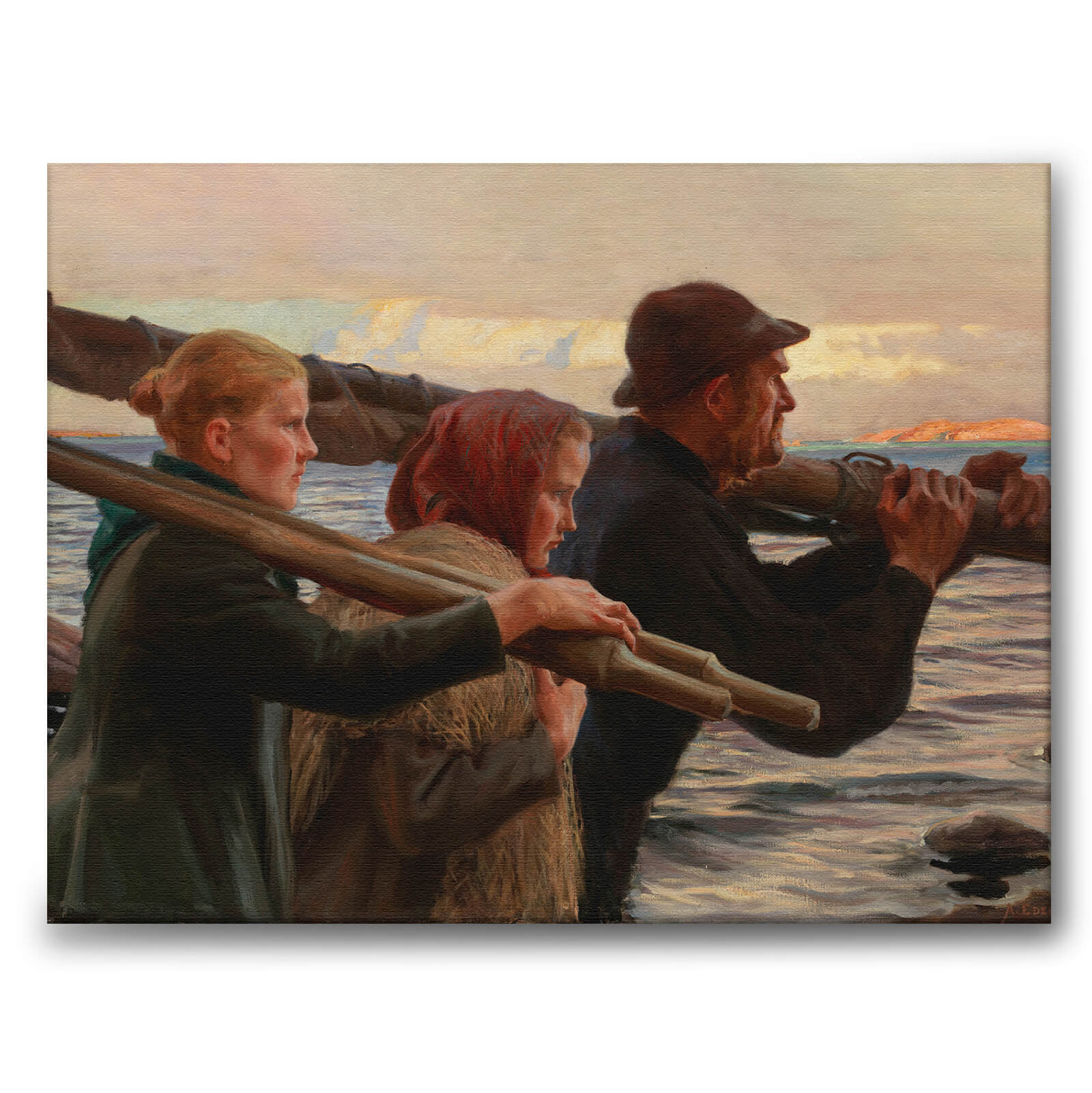 Canvas with the beautiful painting In the Outermost Cuts created by Albert Edelfelt in 1898. In the painting we see two women and a man carrying oars, fishing nets and a mast. In the background we see the sea and a fantastic sky at sunrise.