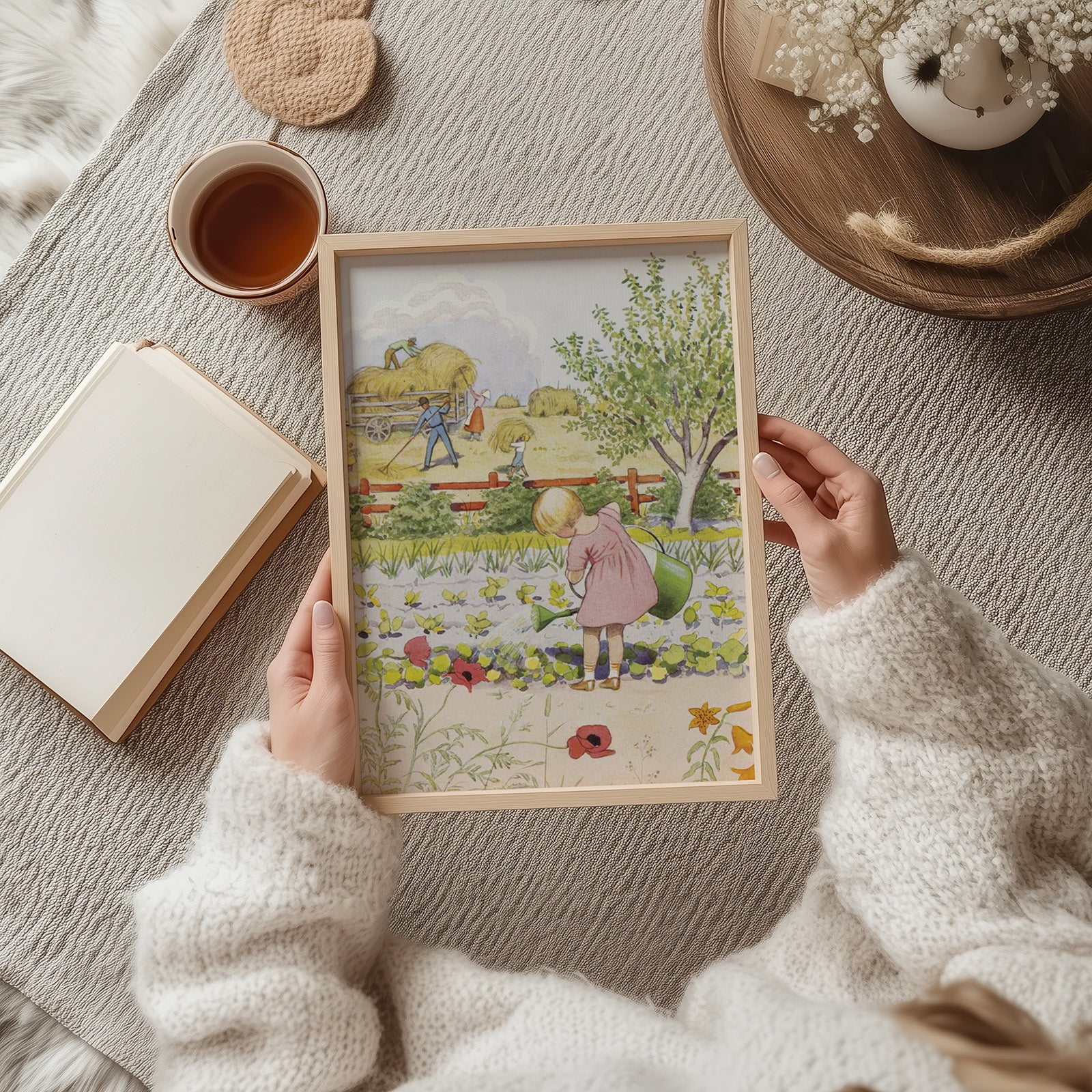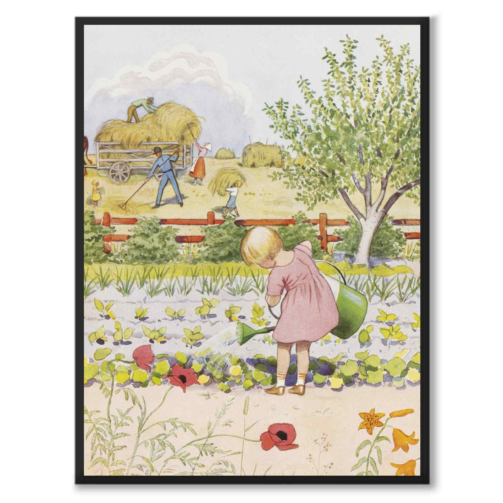 In the book it says: The sun burns the spinach and parsley, the leaves wilt on the poppy and lily, the soil is so dry in the flower bed, all the flowers cry out for water. Brita strokes the jug so eagerly. Come and help her then, someone else! No, the others with the mowers hurry. Listen! Didn't that sound like thunder? Rumble on and let the lightning pop! Soon the rain will fall in torrents! Brita laughs: Now they get all happy, all the plants, when they get to bathe!