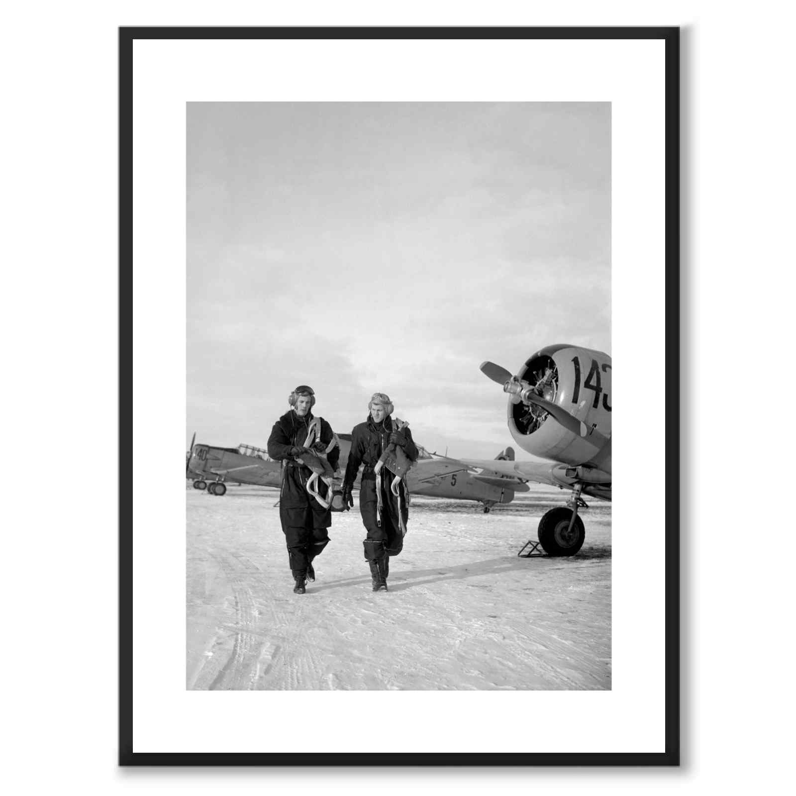 Poster with a vintage photograph of the Krigsflygskolan in Ljungbyhed in 1950. In the photo we see two pilots walking towards the camera with a propeller plane in the background.