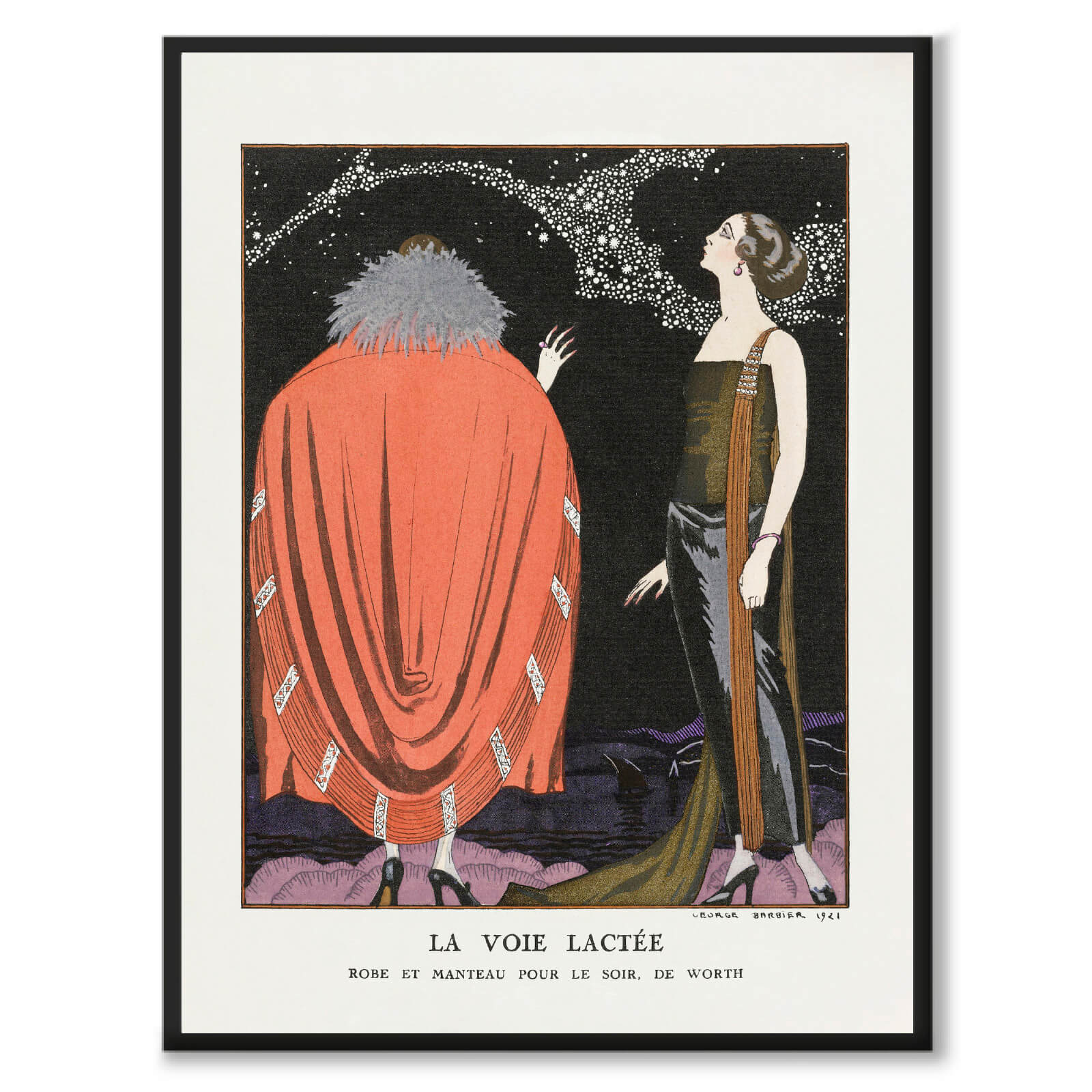 Poster with an illustration from a French fashion magazine in 1921. On the illustration you see the text La voie lactée: Robe et manteau pour le soir, de Worth - French for Milky Way: Dress and coat for the evening, by Worth
