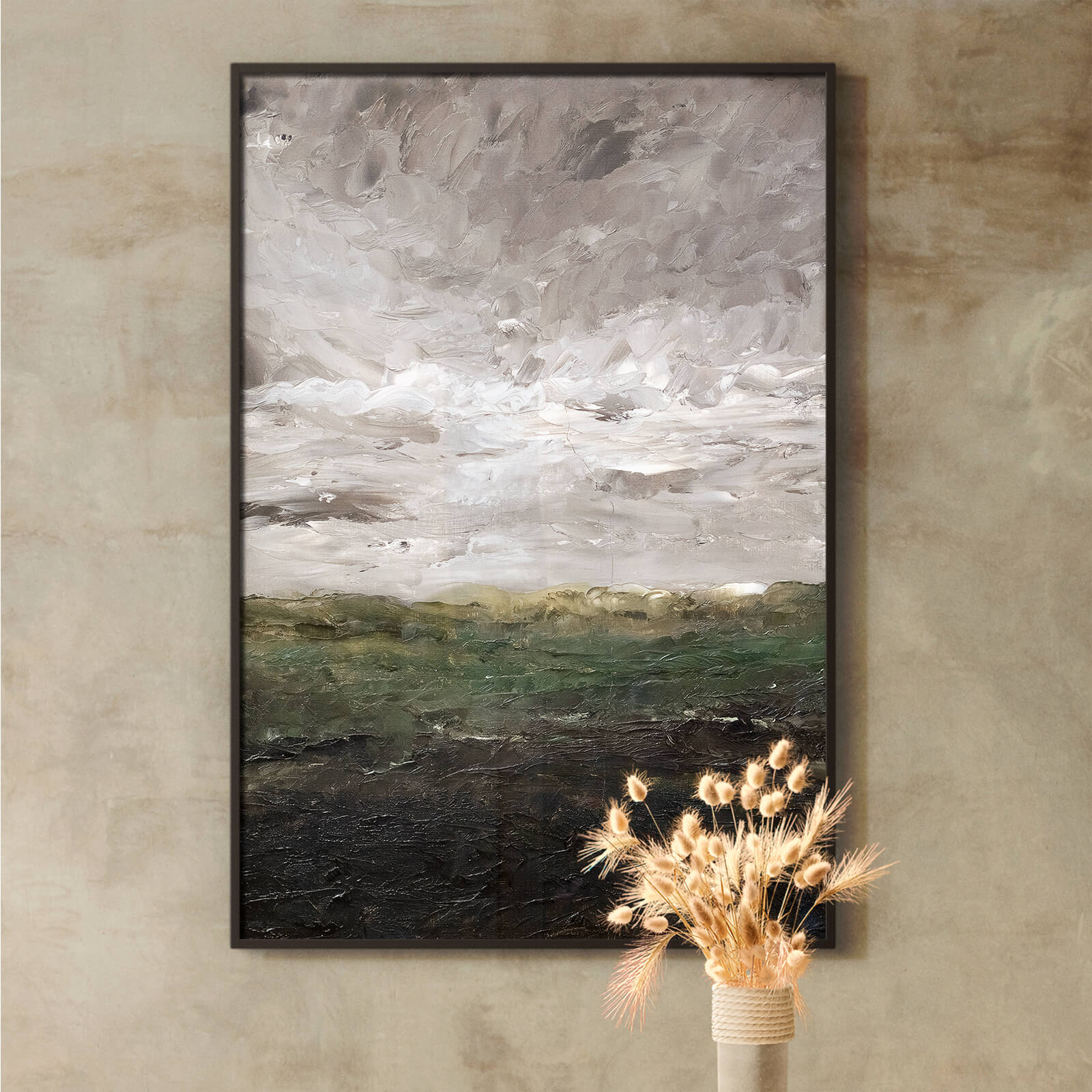 Poster with the painting Landscape study - Heden by August Strindberg. In the picture we see a beautiful, abstract heath with dull dark green colors under a gray sky. The image has a fantastic depth that invites the viewer.