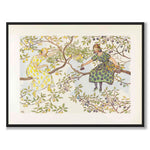 Poster with an illustration from Lasse-little in the garden, one of Elsa Beskow's many beloved children's books from the year 1923. Two young women representing yellow and purple plums sit in a plum tree and throw down fruit.