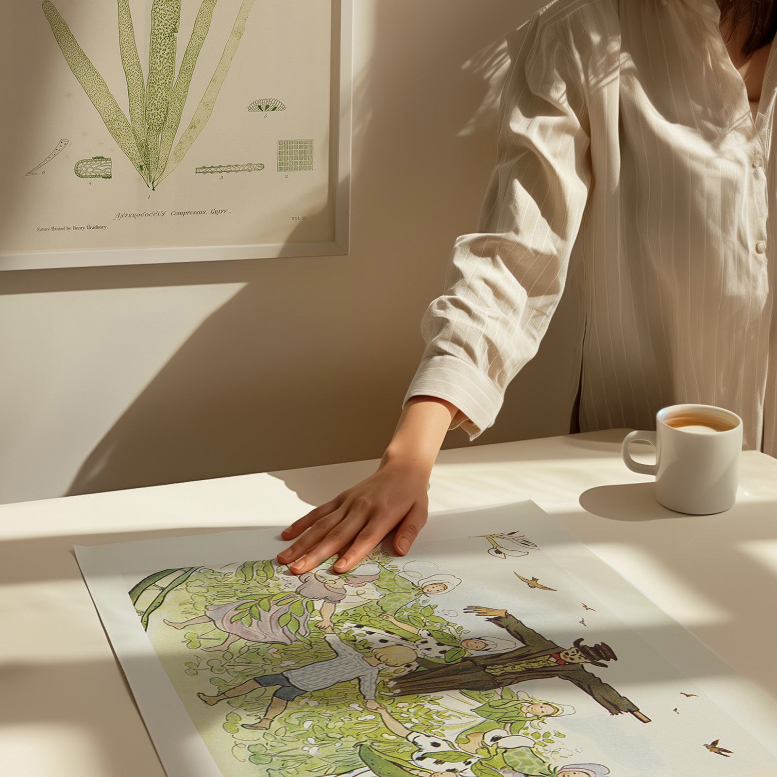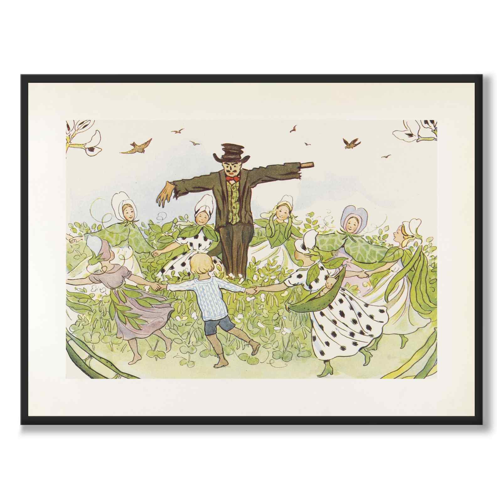 In the motif, little Lasse, his friend September and the garden's peas and beans dance around Fabror Fågelskrämma. An excerpt from the book on the subject: