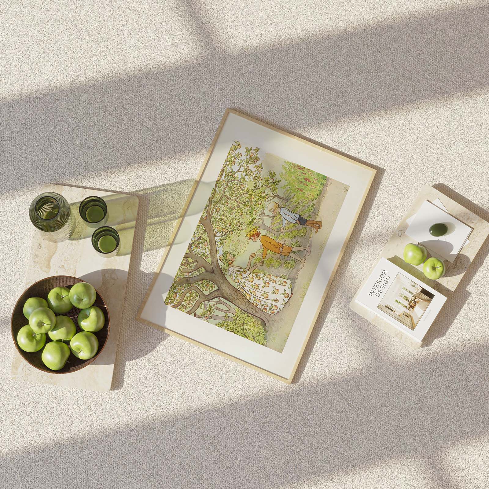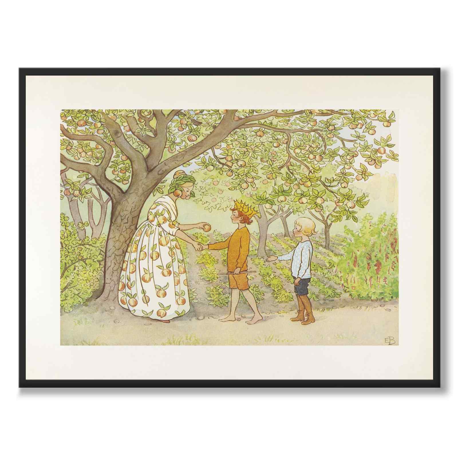 Poster with an illustration from Lasse-little in the garden, one of Elsa Beskow's many beloved children's books from 1923. The motif is called Song of the Apple Tree. Little Lasse and his friend September meet the apple tree personified by a beautiful young woman.