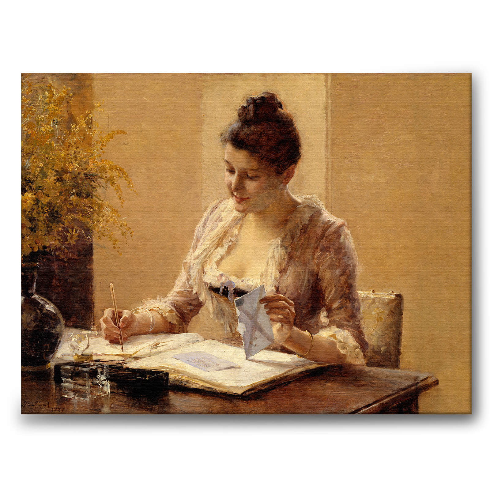 Canvas with a painting by the internationally known Finnish artist Albert Edelfelt from 1887 and the realism movement. The painting shows the importance of the handwritten letter and the writing place in the bourgeois home. On the table, the glass inkhorn is open and it seems as if the woman is answering a letter she has just opened, taking care not to keep the sender waiting. A technically exquisite detail in the image is the envelope she is holding in her hand, or more precisely how it is illuminated and becomes transparent.